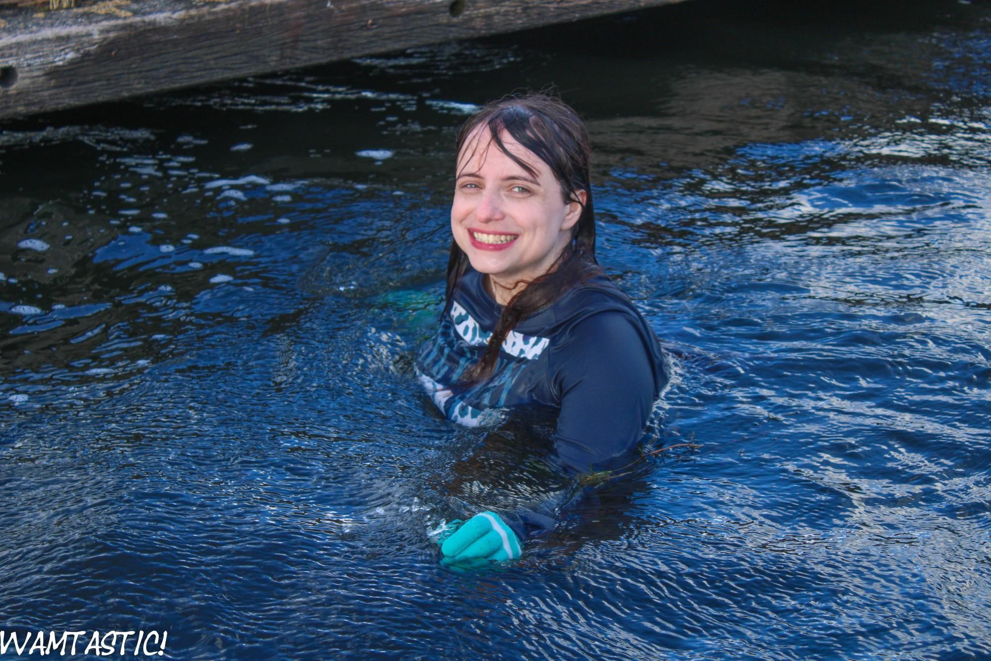 Kyra is running around the lake, and decides to turn her jog into an aquajog by running into the water! She's wearing blue sneakers, a very white, very see-trough top (without a bra!) and black sports leggings. She runs into the water and takes a dive, and swims around a lot, splashing water everywhere with her shoes. She tries to climb up onto the buoyance post and plays along the buoyancy line. After her little swim and cool down, she runs out onto the shore.