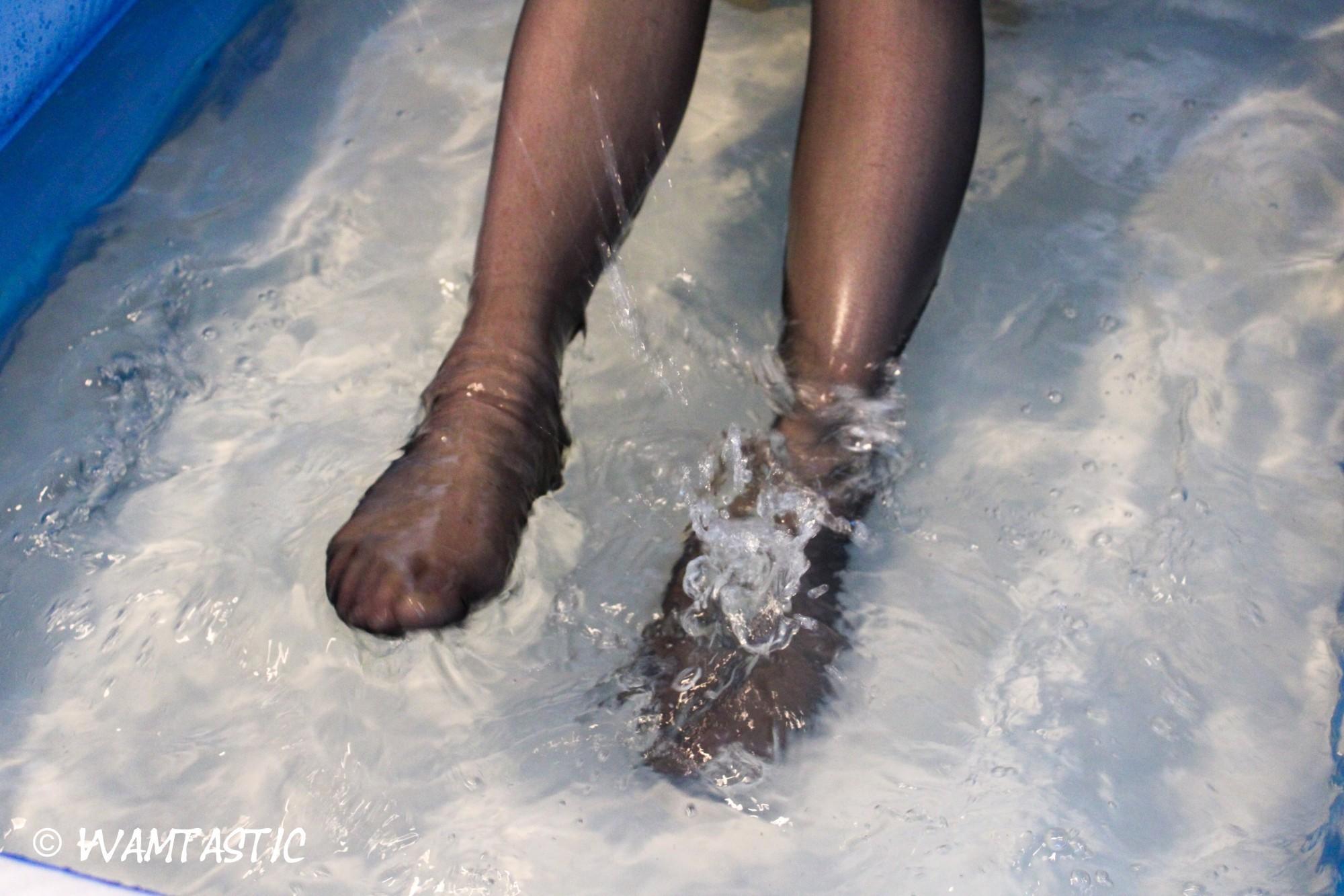 The weather is dull and Eileen is bored. She's wearing a cute red top, sports leggings and sneakers. She decides to freshen up a bit by taking a bath. She slowly soakes her shoes and shirt, before soaking her hair and keeps spraying herself with the warm water, relaxing. Eventually, the bath starts to fill, and she slides in to start a lazy afternoon.
