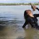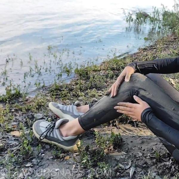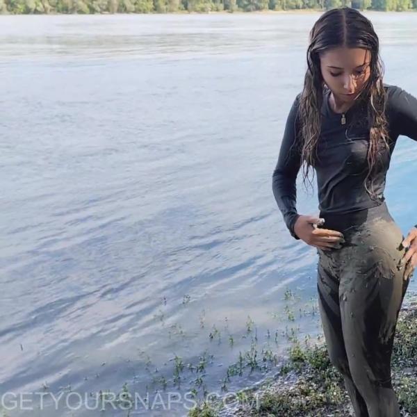 Ellie steps into the river wearing grey long sleeves, sporty leggings, and sneakers. As the water slowly soaks her outfit, she spots a muddy patch nearby and playfully covers her leggings in thick mud — just to rinse it all off again in the water. A lighthearted mix of wetlook and muddy fun in one 13:37 min FHD video.