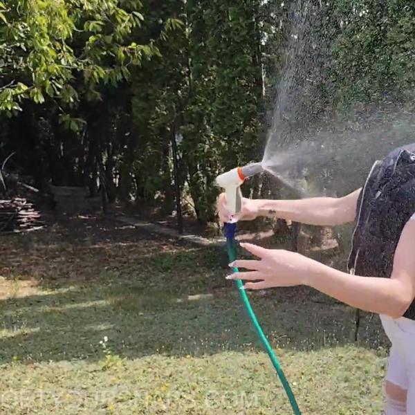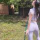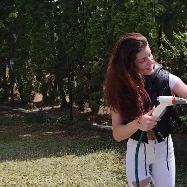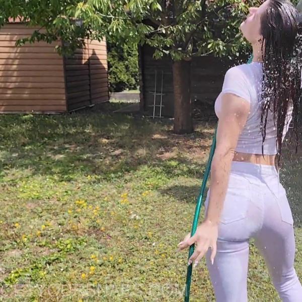 Jazmin takes on a breezy, slightly chilly day in pure wetlook style! Dressed in white pants, sneakers, a sheer white top, and a black vest, she grabs the garden hose and soaks herself from head to toe. As the water runs and the grass gets wetter, off comes the vest and even the shoes — because running barefoot through wet grass feels amazing. Once she’s fully in the mood, she hands over the hose and strikes some jaw-dropping poses while getting drenched all over again.