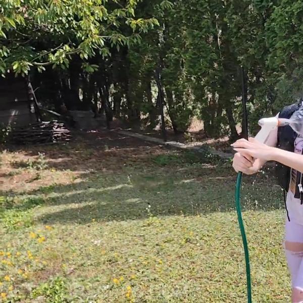 Jazmin plays with the hose