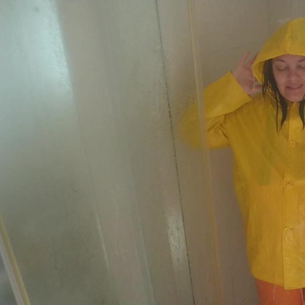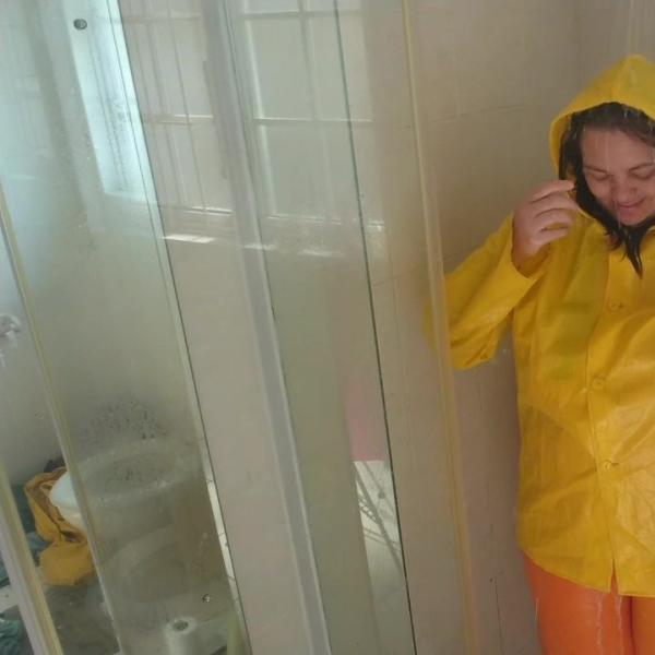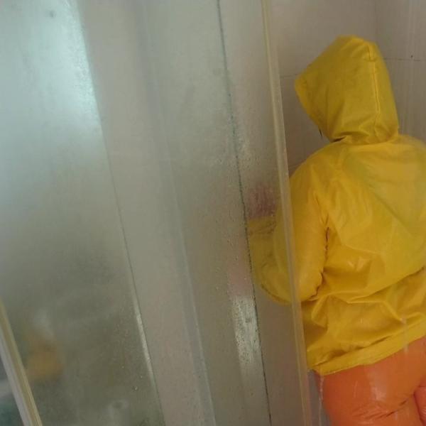 I wear orange and yellow rainwear and get soaking wet in the shower, allowing the water to run over the hood and face and body.