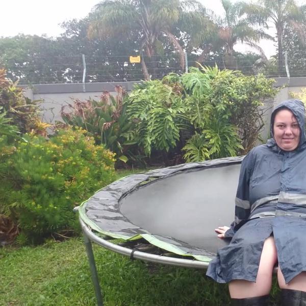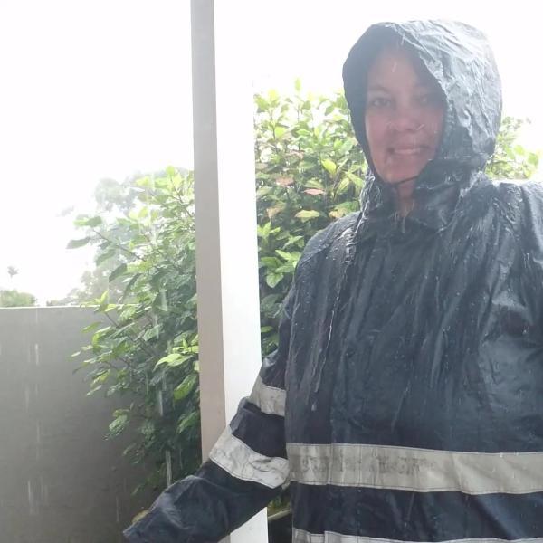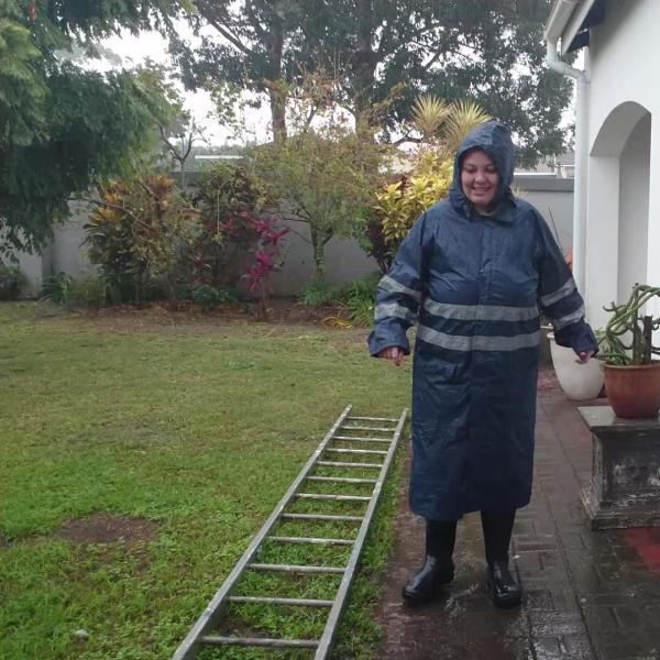 I wear my long navy blue rain coat and my wellies and get wet in the pouring rain with a bit of jumping in puddles.