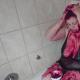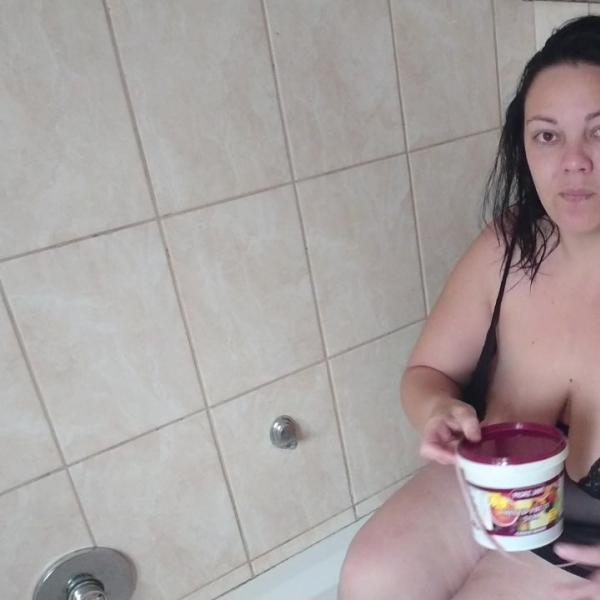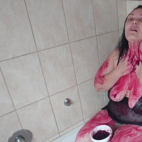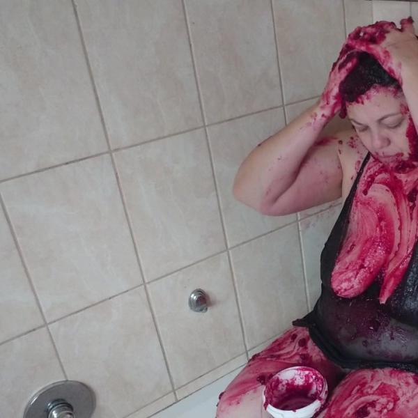 I wear a black lingerie dress and smear mixed fruit jam all over myself before I get my hair covered in this sticky mess and massage it in.