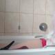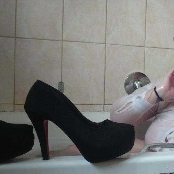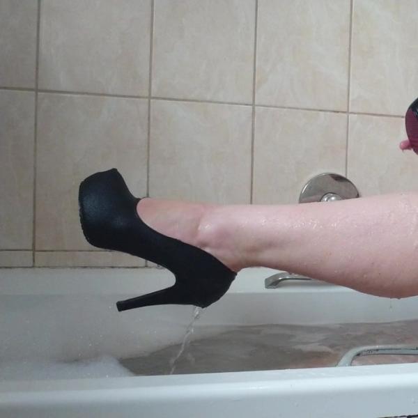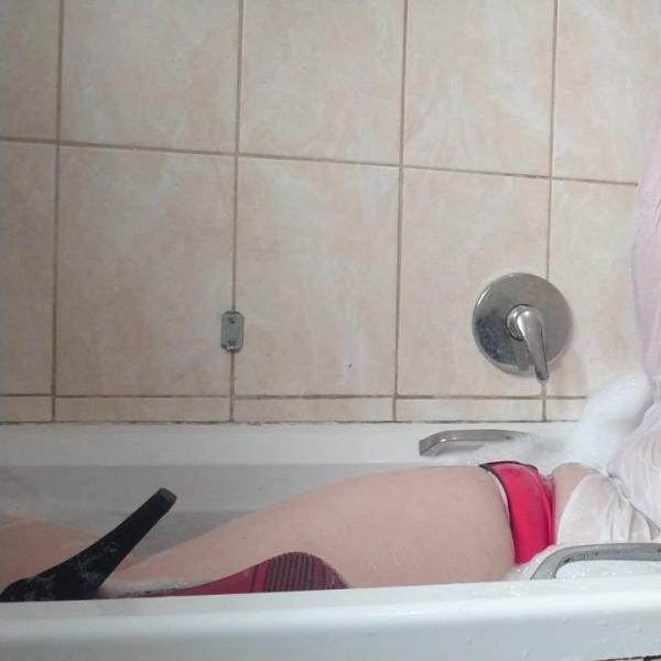 I wear 6 inch high heels with a white blouse and and sexy red PVC bikini bottom, and get myself soaking wet in the bathtub by pouring water over myself and dunking myself underwater.