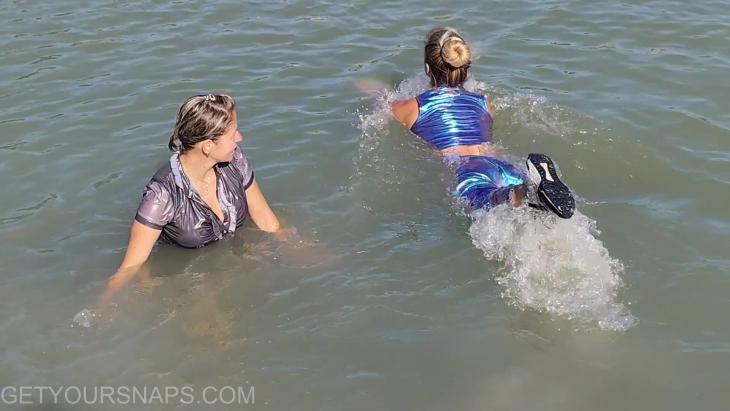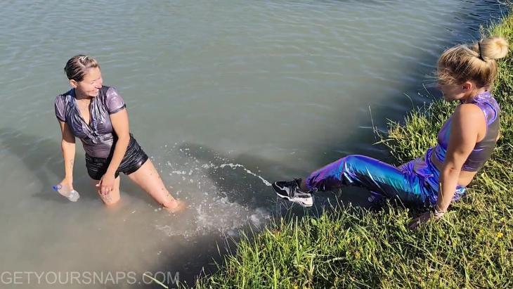 Lucy was already soaked and spinning around in the lake when Vickey showed up — dressed in a striking steel-blue rave outfit. She didn’t hesitate to jump in beside Lucy, and together they turned the summer day into a playful water adventure.