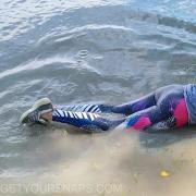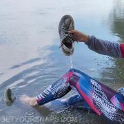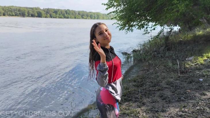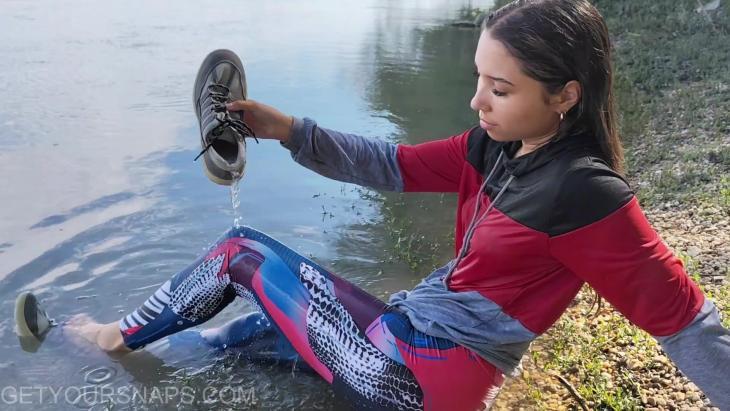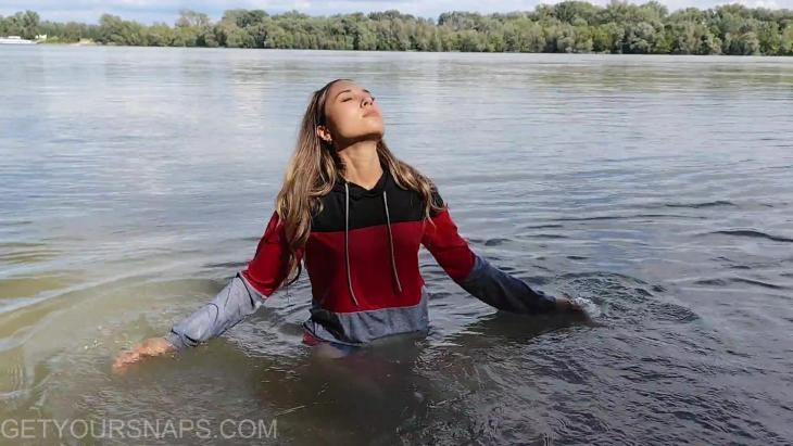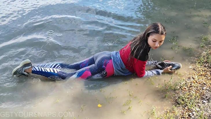 Ellie brings her playful energy to the riverside, stepping in fully dressed and enjoying every splash. In her sporty outfit with colorful leggings and a hoodie, she doesn’t hold back — lying down in the shallows, soaking her shoes, and letting the water flow over her.