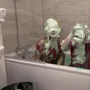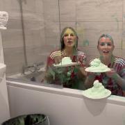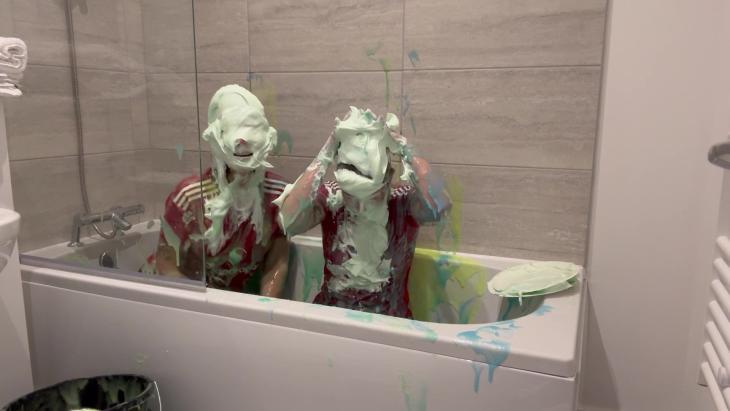 Emily then gets the 4 pies ready, with each girl pieing themselves in the face before pieing each other finishing off their messy forfeit with both girls completely covered!