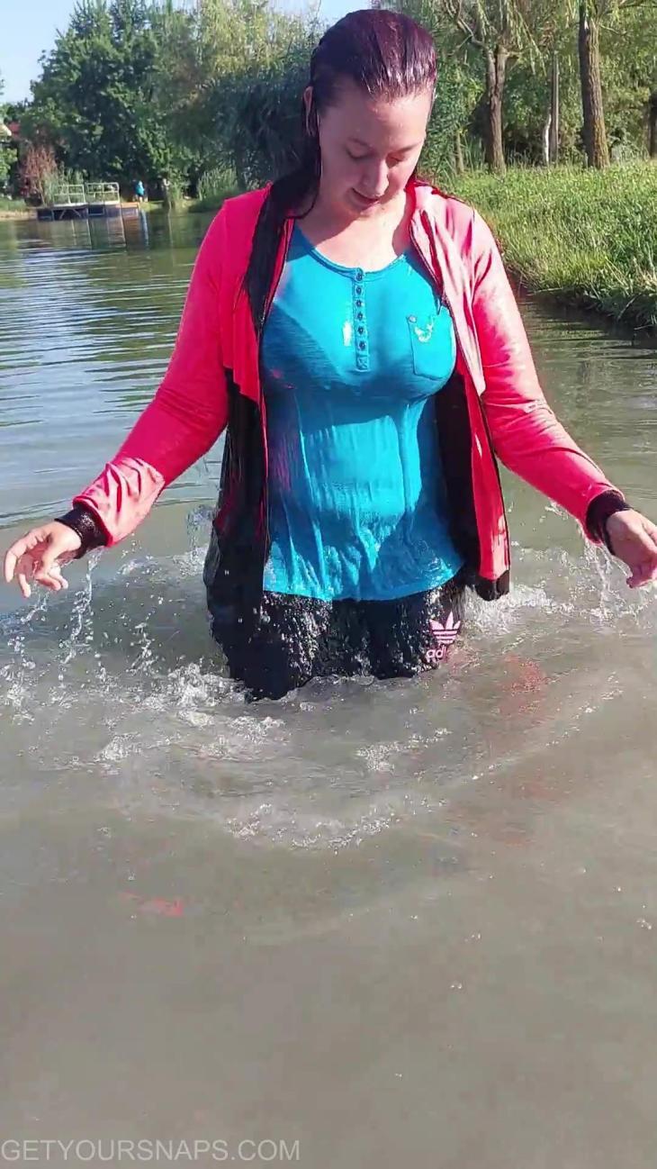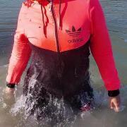 Continuing the lakeside series with Kiara and Mona, this time Kiara takes the camera to capture Mona’s playful soak. Dressed in a bright Adidas tracksuit with a colorful jacket and sporty leggings, Mona steps into the lake and lets the water completely drench her.