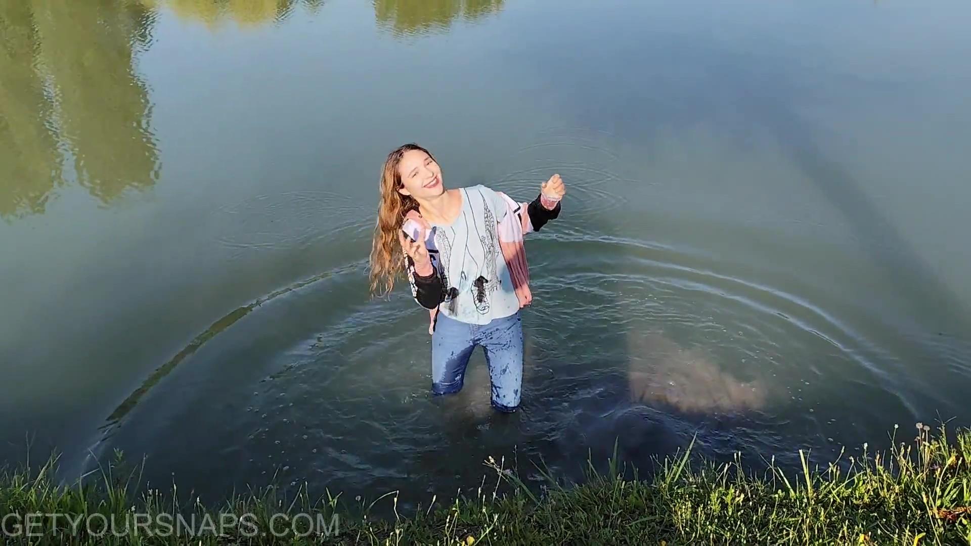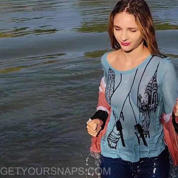 This video was filmed at the end of summer — and it’s been a while since we’ve had a proper wet jeans session! Violet kicks things off wearing jeans and a cozy sweater, stepping into the water for a relaxed, playful soak.