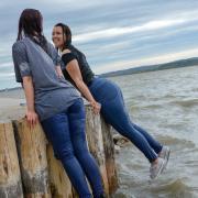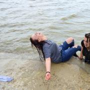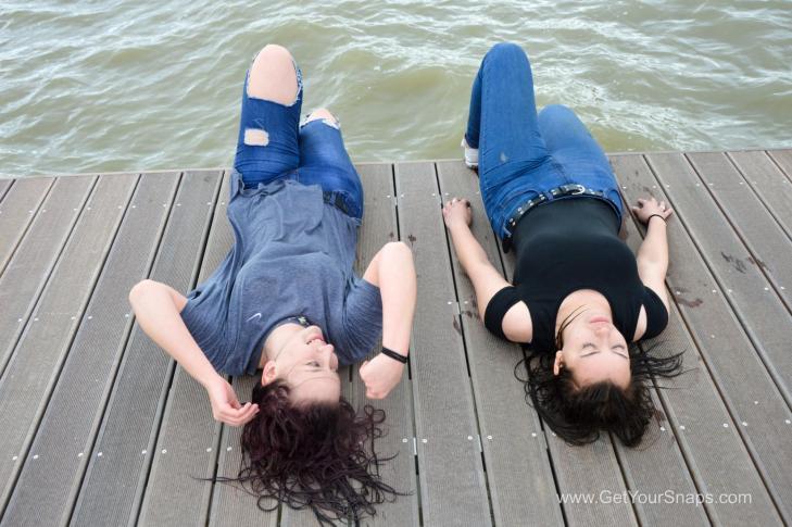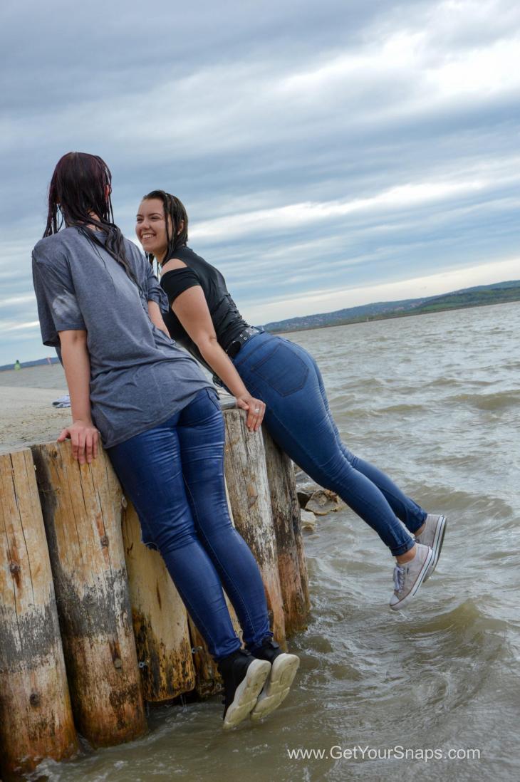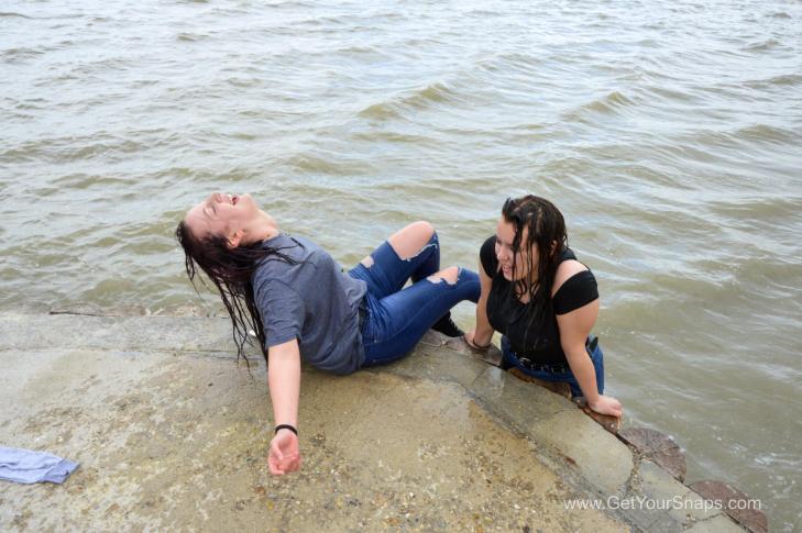 Wearing jeans, sneakers, and casual tops, the two girls laugh and play as the waves splash around them, soaking completely in the cold water. Their fun and chemistry make this spontaneous lakeside wetlook session truly special.