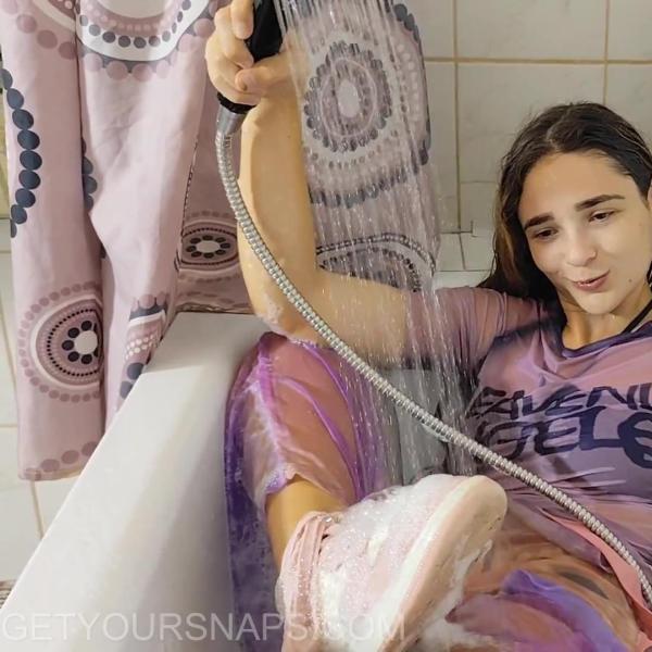 This video has a slightly more experimental touch than usual — we wanted to see how this kind of outfit behaves when it’s fully soaked, and the result is absolutely worth it. Violet looks incredible as the fabric clings and shimmers under the water, perfectly blending sporty and street style.