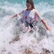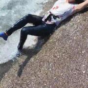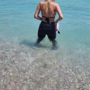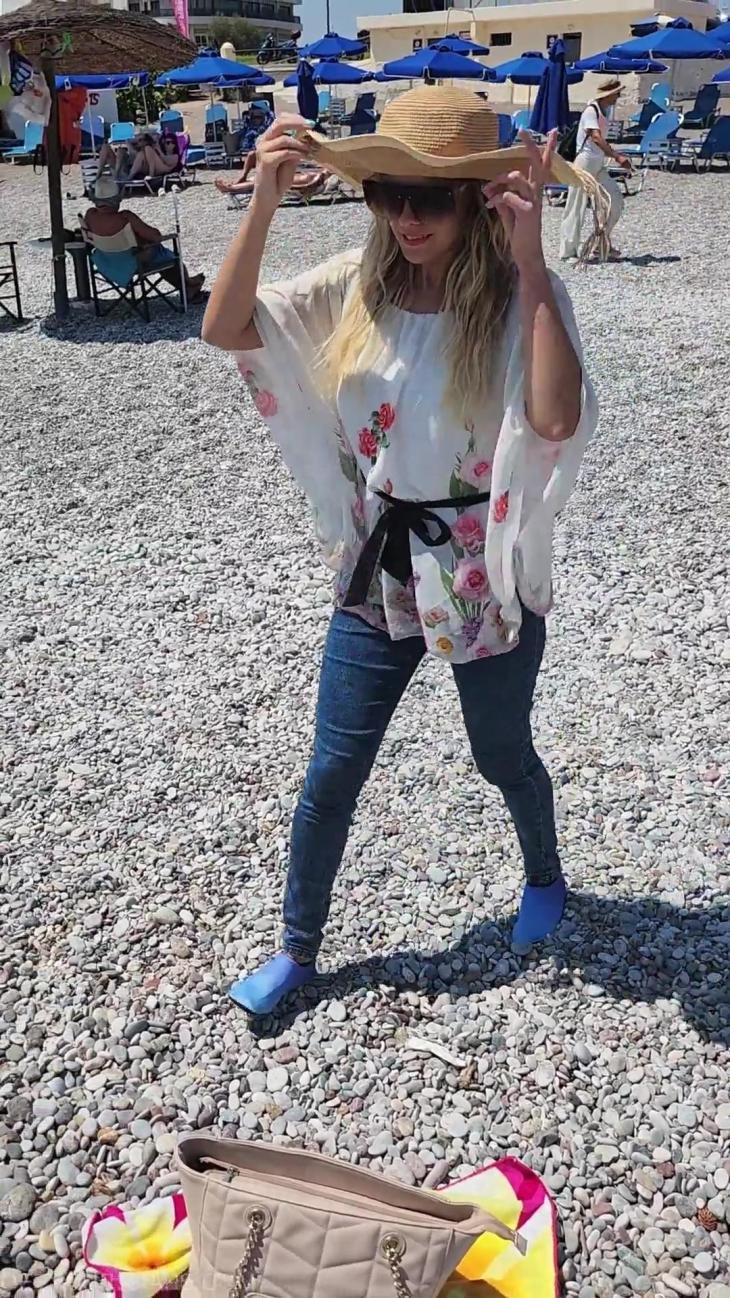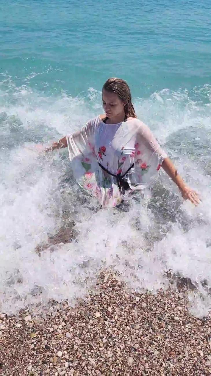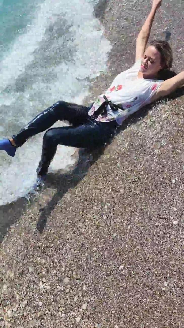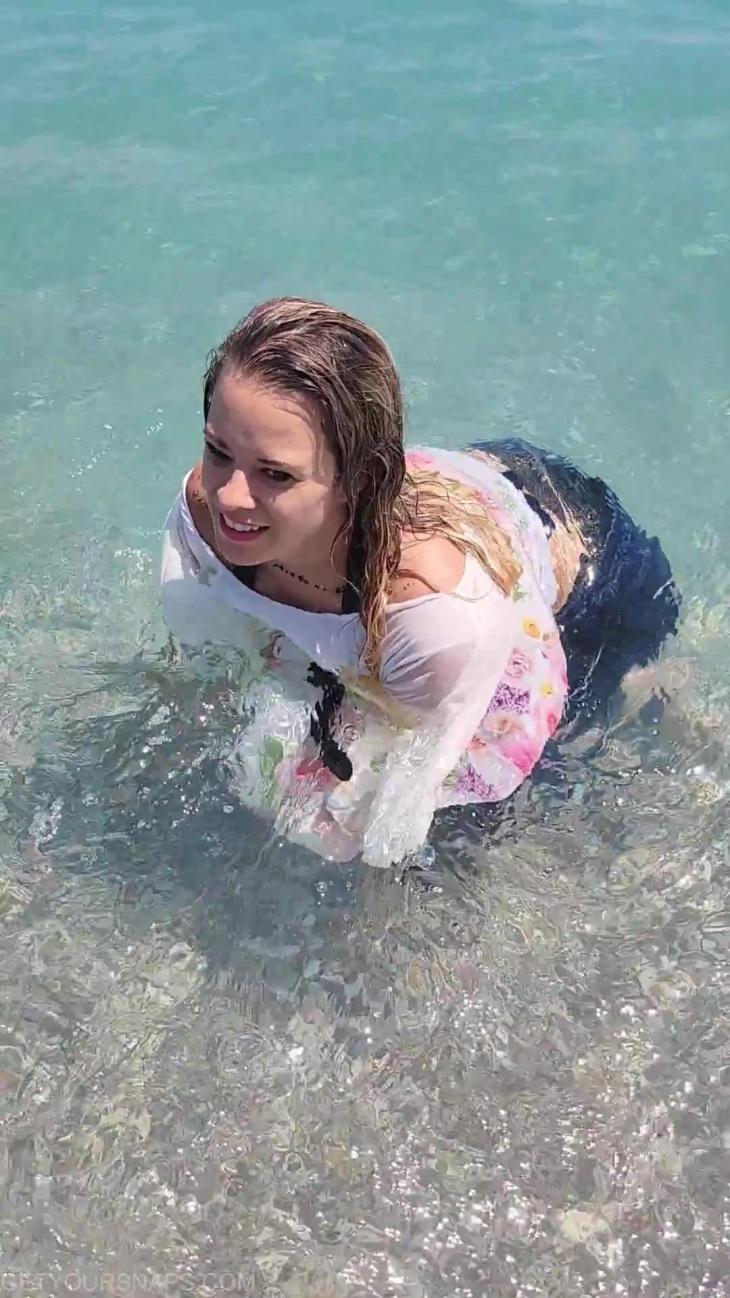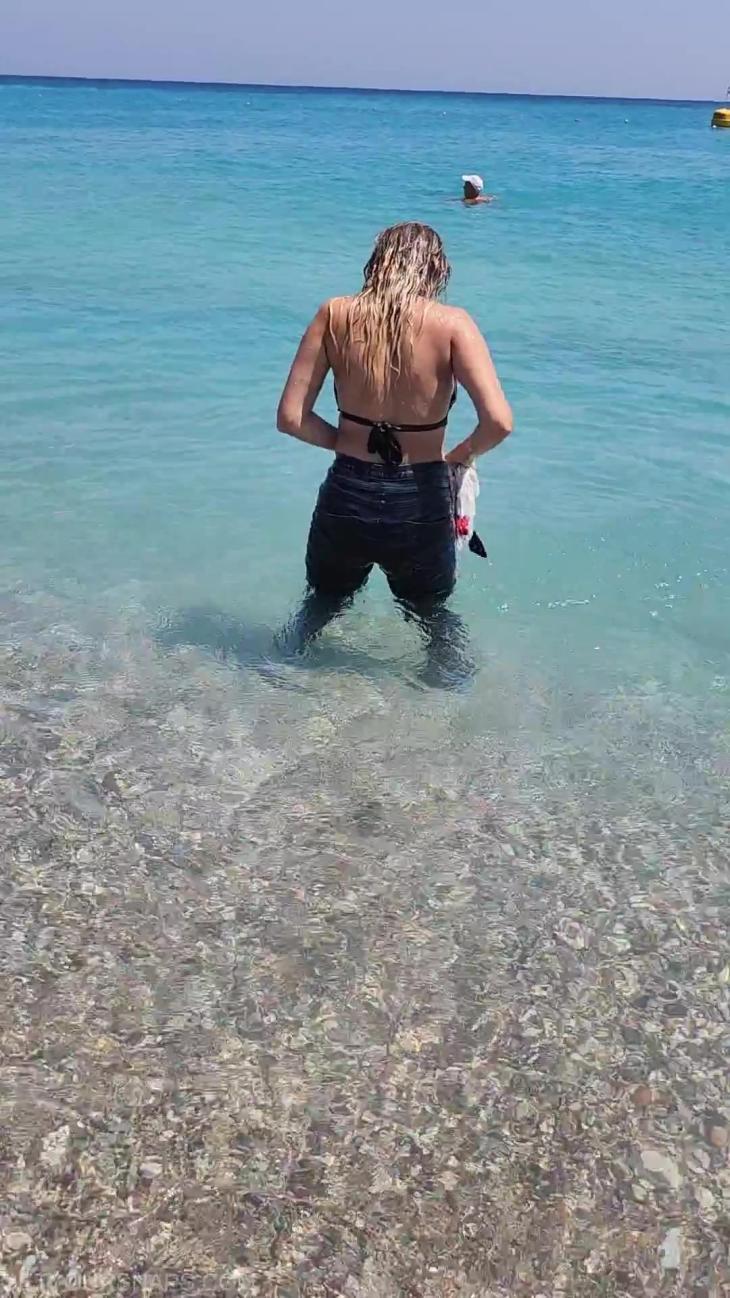 Sometimes the best moments happen spontaneously — like when Bella, while walking by the seaside, decided to take a fully clothed dip in the ocean. With Gina behind the camera, she didn’t hesitate for a second — stepping straight into the waves, laughing as the water soaked her loose top and her tight jeans began to cling to her legs and hips.