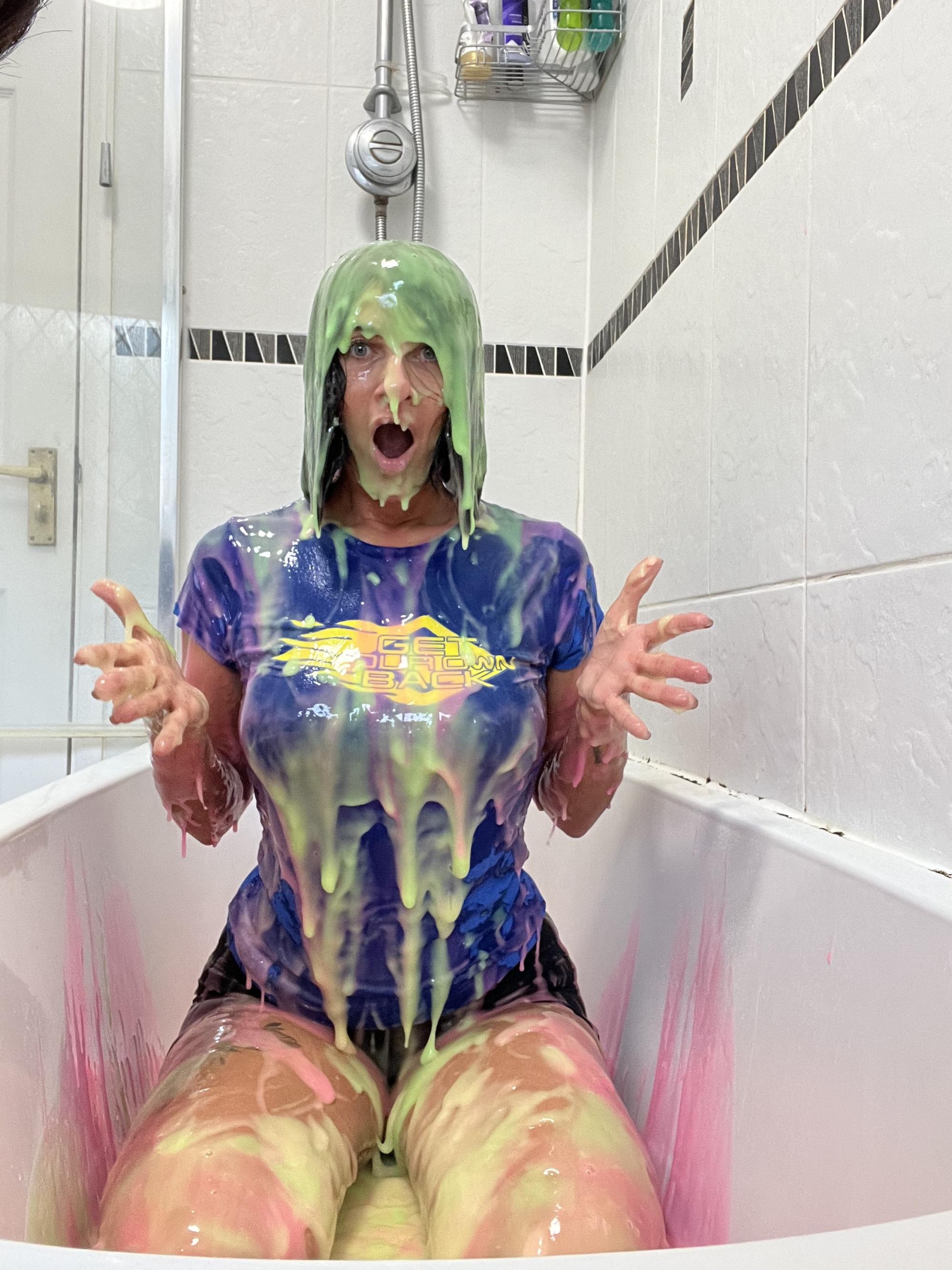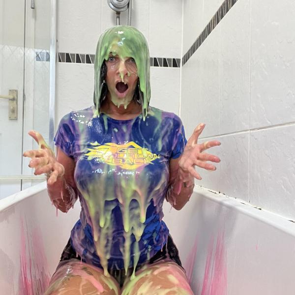 Green gunge falls from above completely covering her, much to her dismay! Sarah constantly complains throughout how slimy and disgusting it is and how she doesn't deserve it as she gets messier and messier with green and pink gunge!