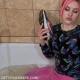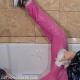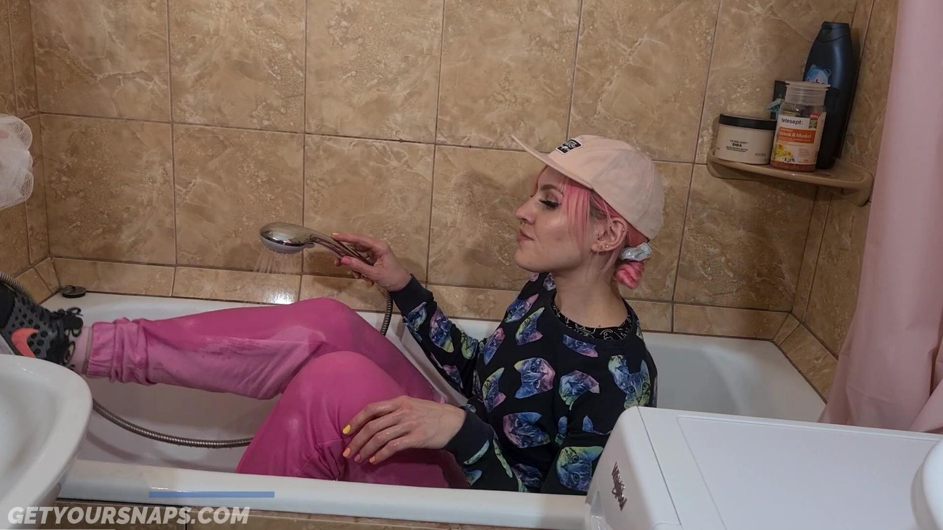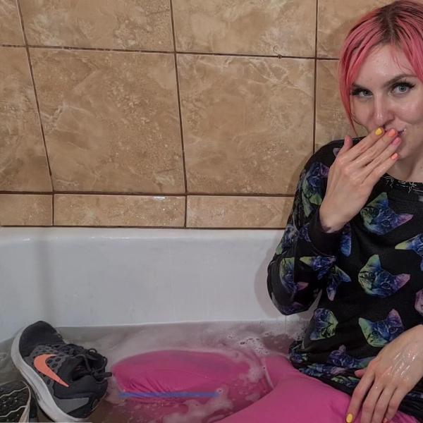 Wearing her colorful cat-print sweater, bright pink pants, and sneakers, she takes over the bathroom, hopping into the tub with a playful grin. What starts as a small splash quickly turns into a full shower-soak — shoes, clothes, and all. The mix of bright colors, bubbles, and her carefree energy makes this one feel fresh and personal.