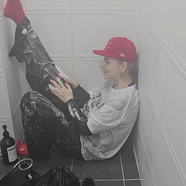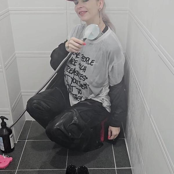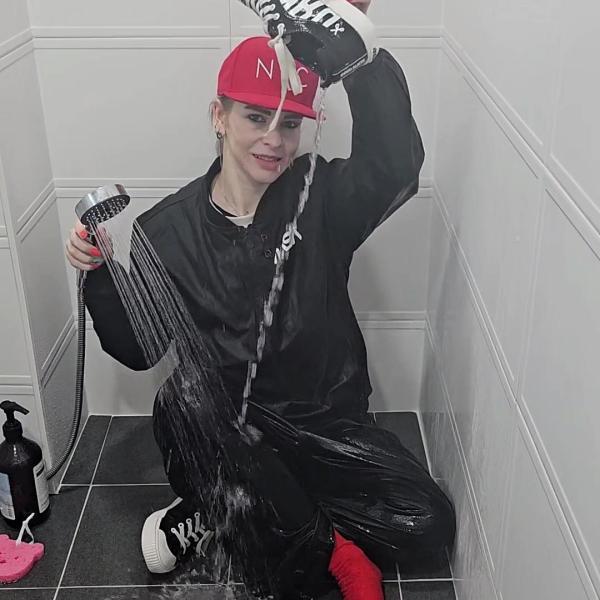 As the spray soaks her from head to toe, her outfit turns darker, shinier, and perfectly clingy. She plays with the water, washes her sneakers and clothes right there on the floor, and enjoys every second of it. The red-and-black combination gives a striking, stylish contrast that makes this set truly stand out.