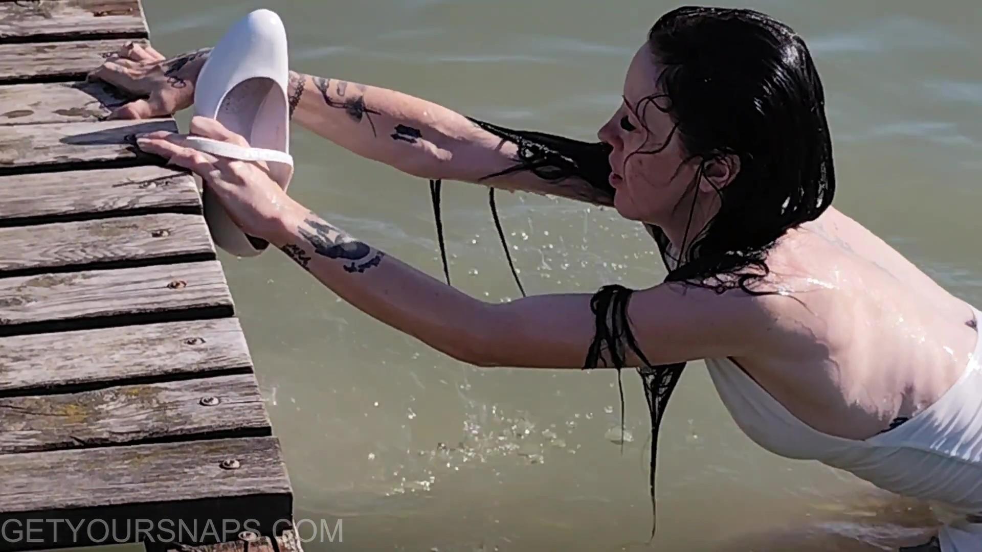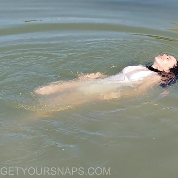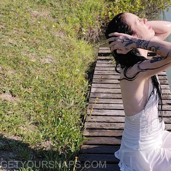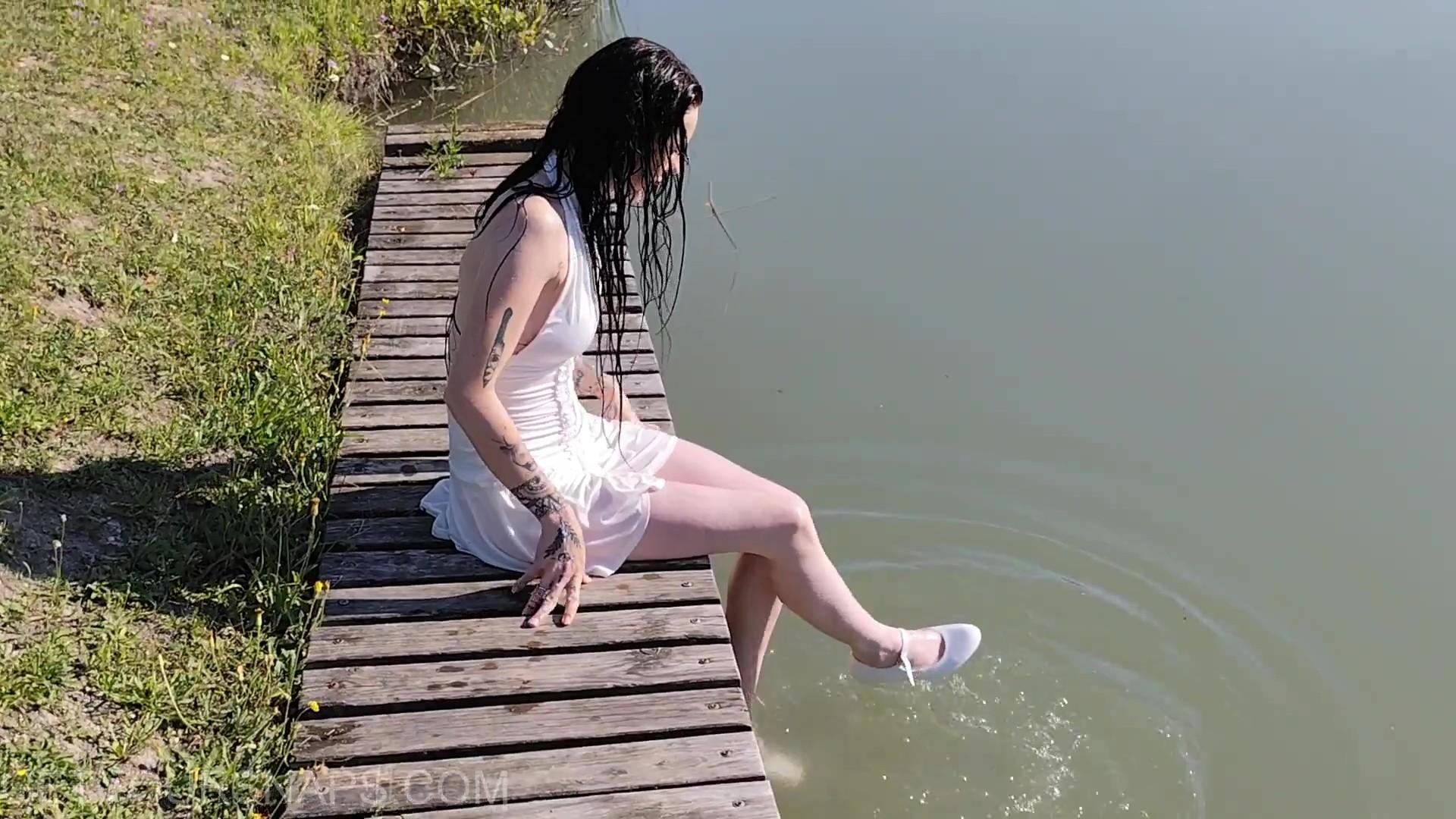 A peaceful afternoon by the lake turns into a beautiful, spontaneous wetlook moment as Carol steps into the calm water in her white summer dress.