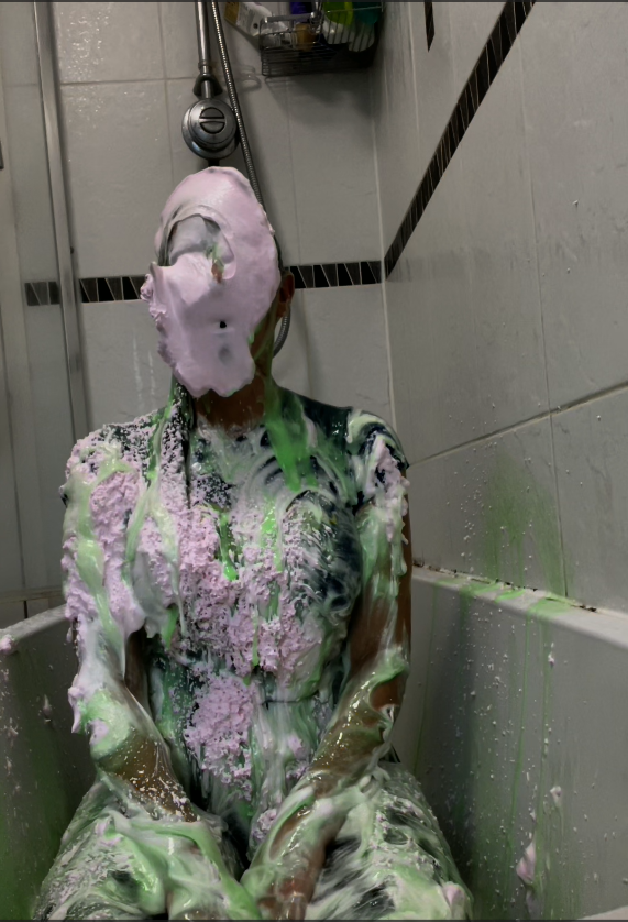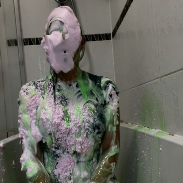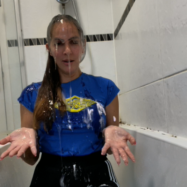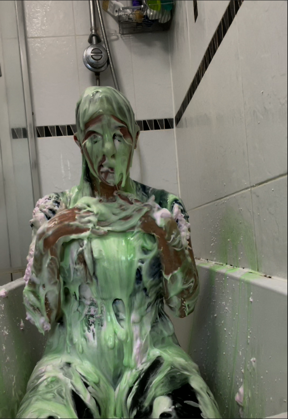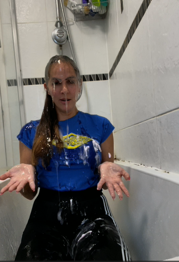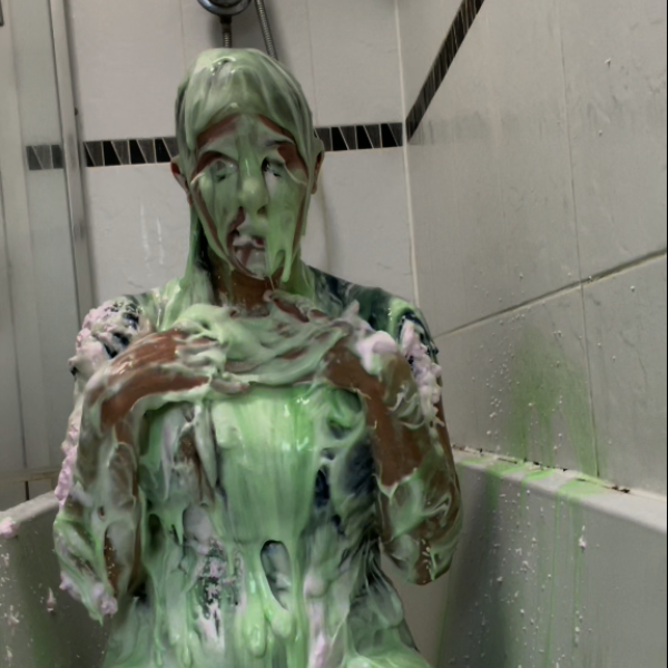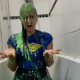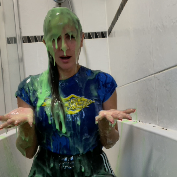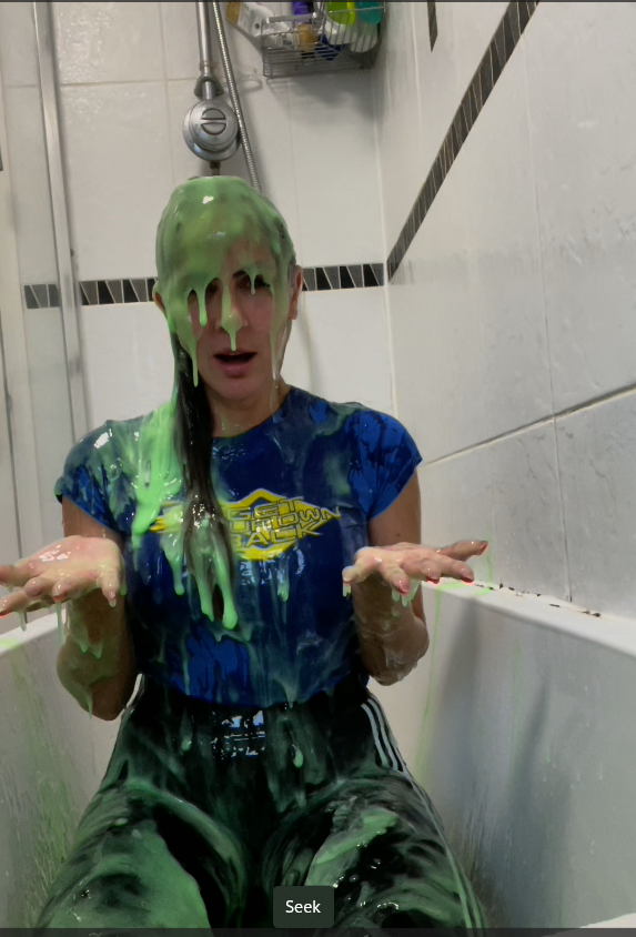 You start with clear gunge, pouring it right over her head, before moving onto green gunge, much to her disgust! She hates it as you continue to cover her from head to toe in the gooey mess, even giving her a pie in the face before spraying her with the can of foam to make sure she is covered!