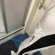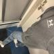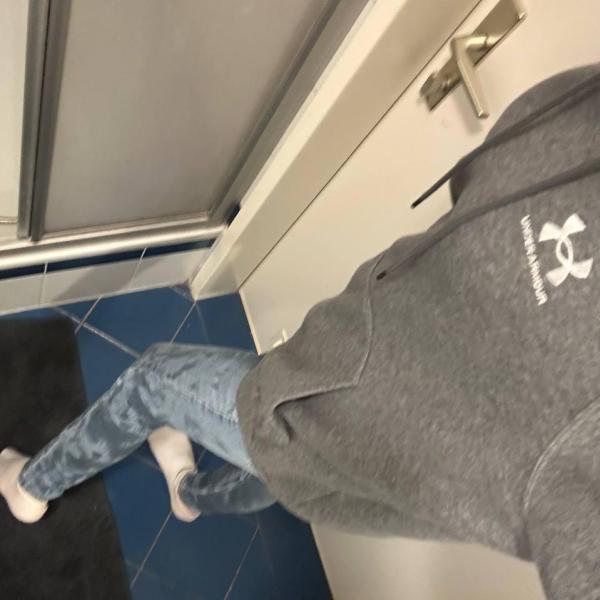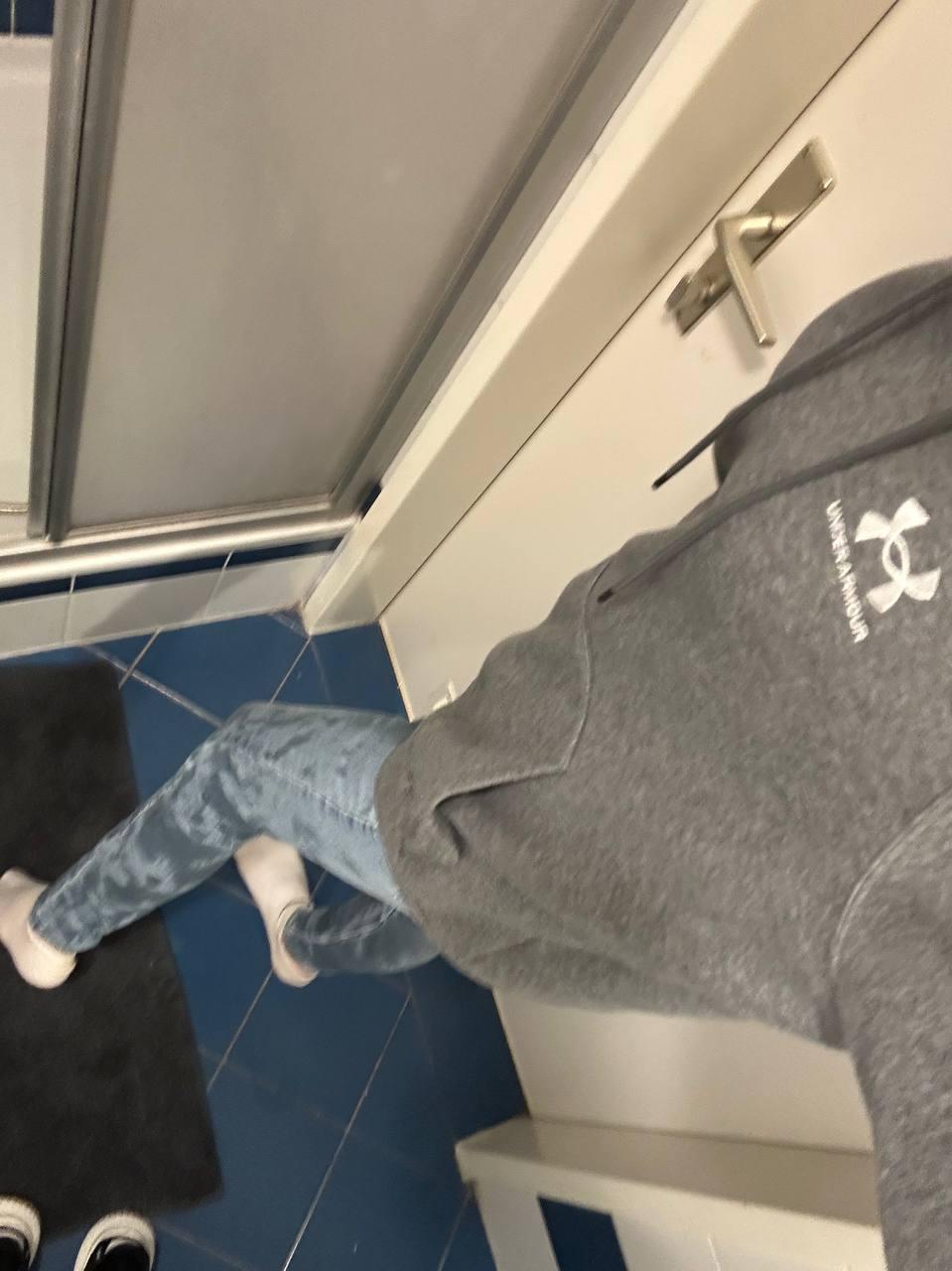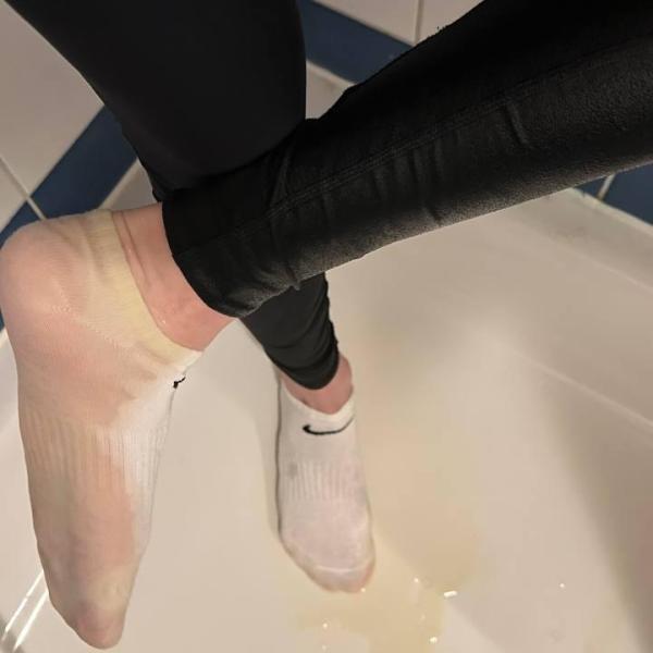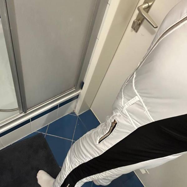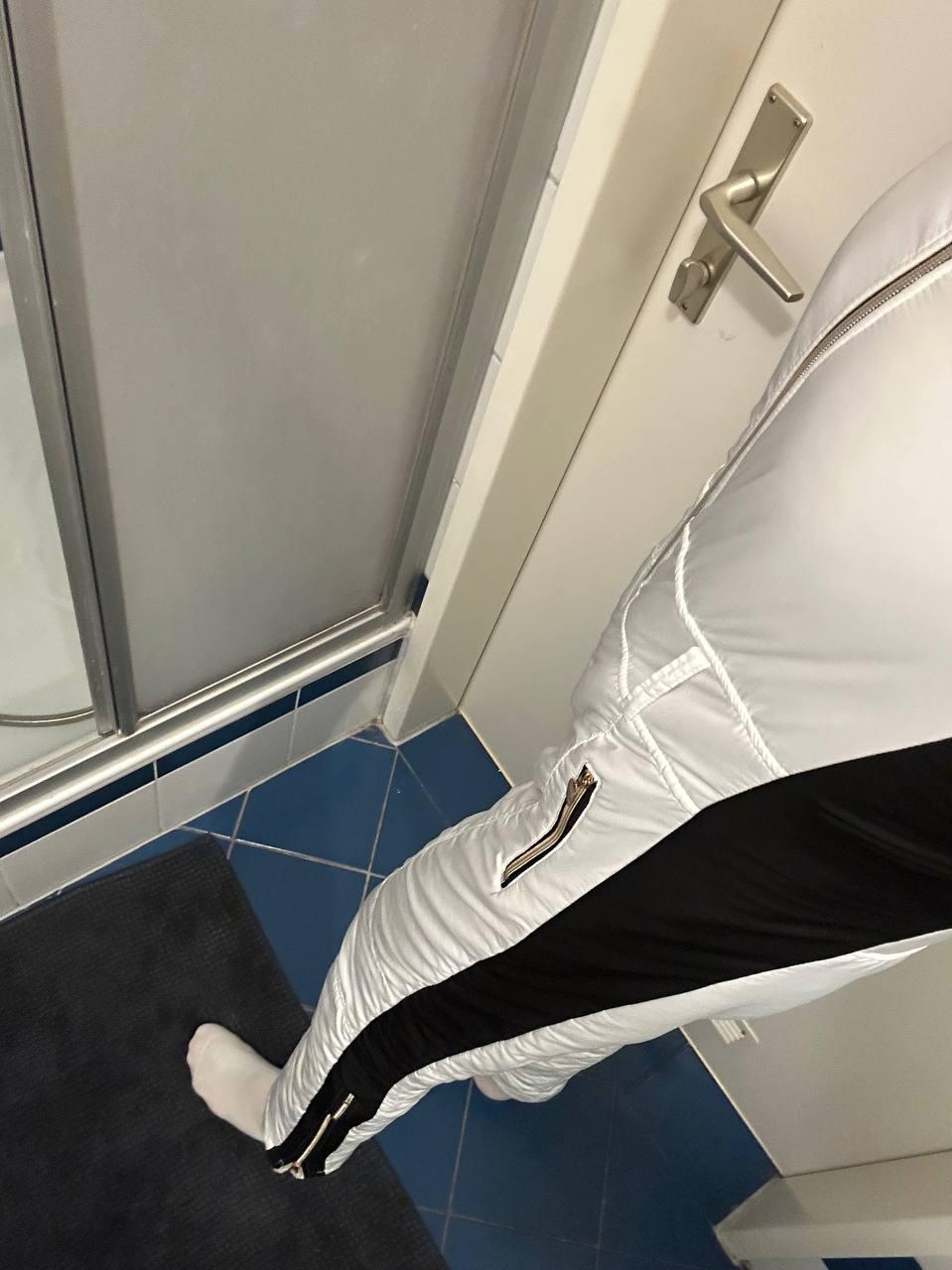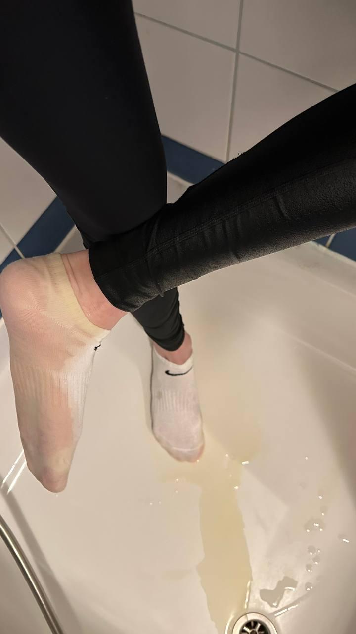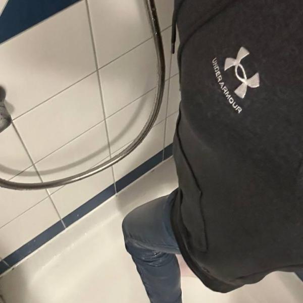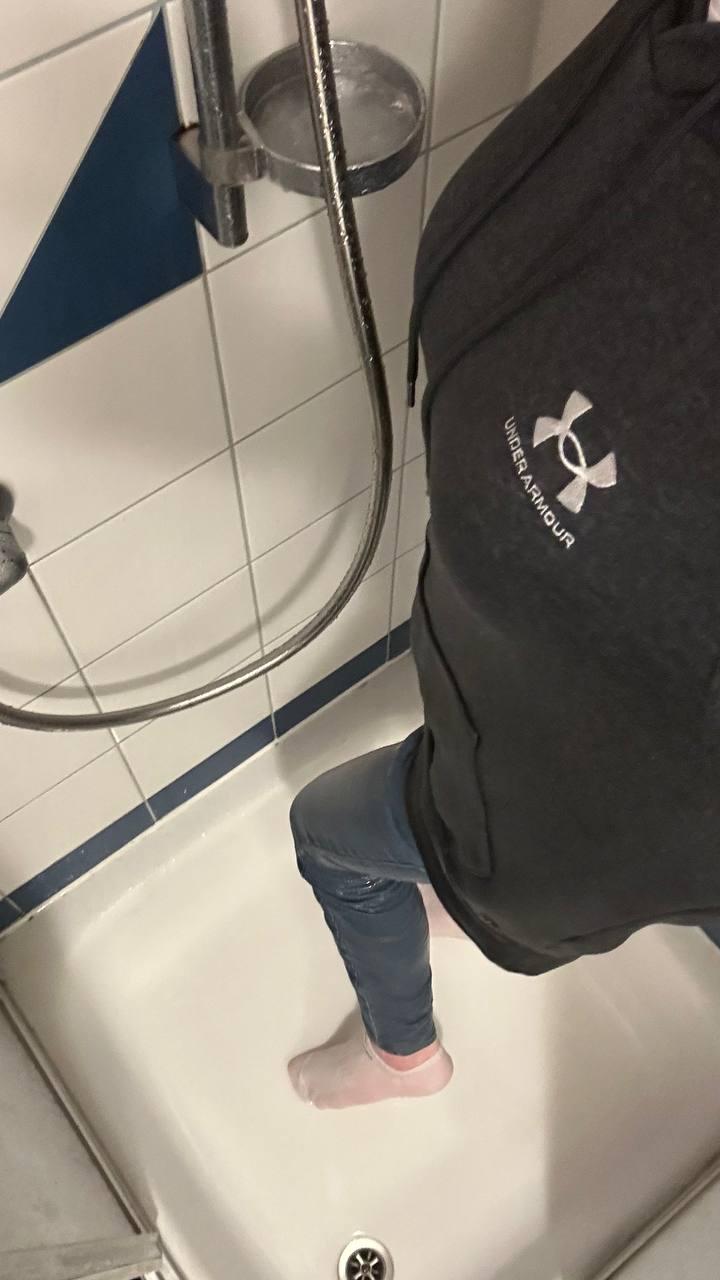 First, Marie pees in a pair of black leggings. Then she puts on a pair of jeans and a snowsuit over the black leggings. Then she goes to take a shower.