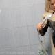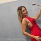 Wearing a tight red dress, trench coat, and thigh-high boots, she slowly turns a regular shower into a playful wetlook moment.
