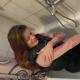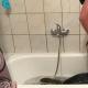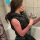 Wearing her shiny black leggings, light long-sleeve crop top, and padded vest, she decides to step right into the tub — clothes, shoes, and all.