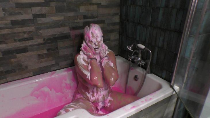 Dolly doesn't stop as she pours the first bucket all over Miss C's head before moving onto the second bucket! Miss C loves the feeling and moans in delight as the gooey mess covers her completely with her loving ever second! All that's left to do is for Dolly to put a huge foam pie right in Miss C's face before leaving her to rub the gungey, foamy mess all over her body!