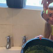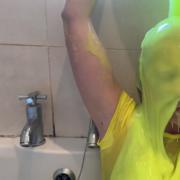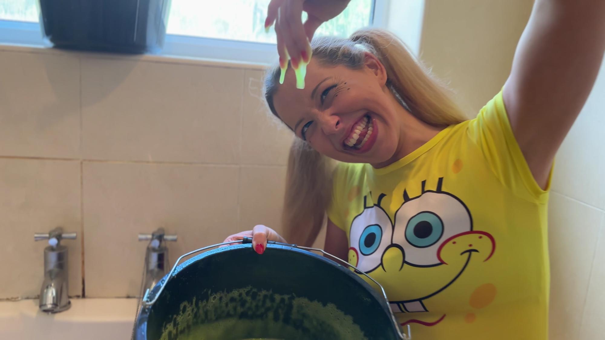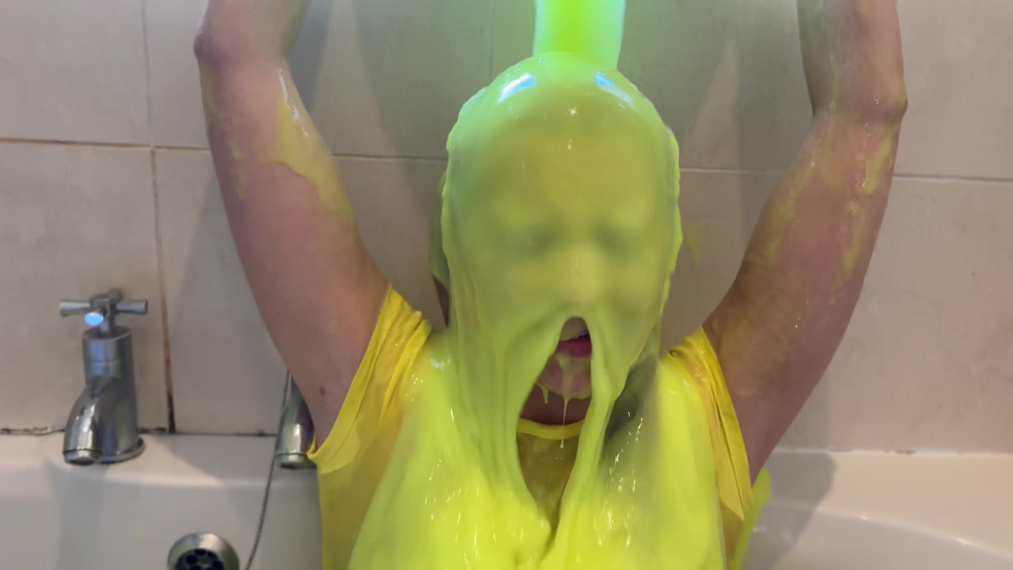 She starts with lots and lots of yellow gunge, pouring it right over her head, covering her from head to toe!