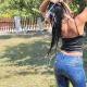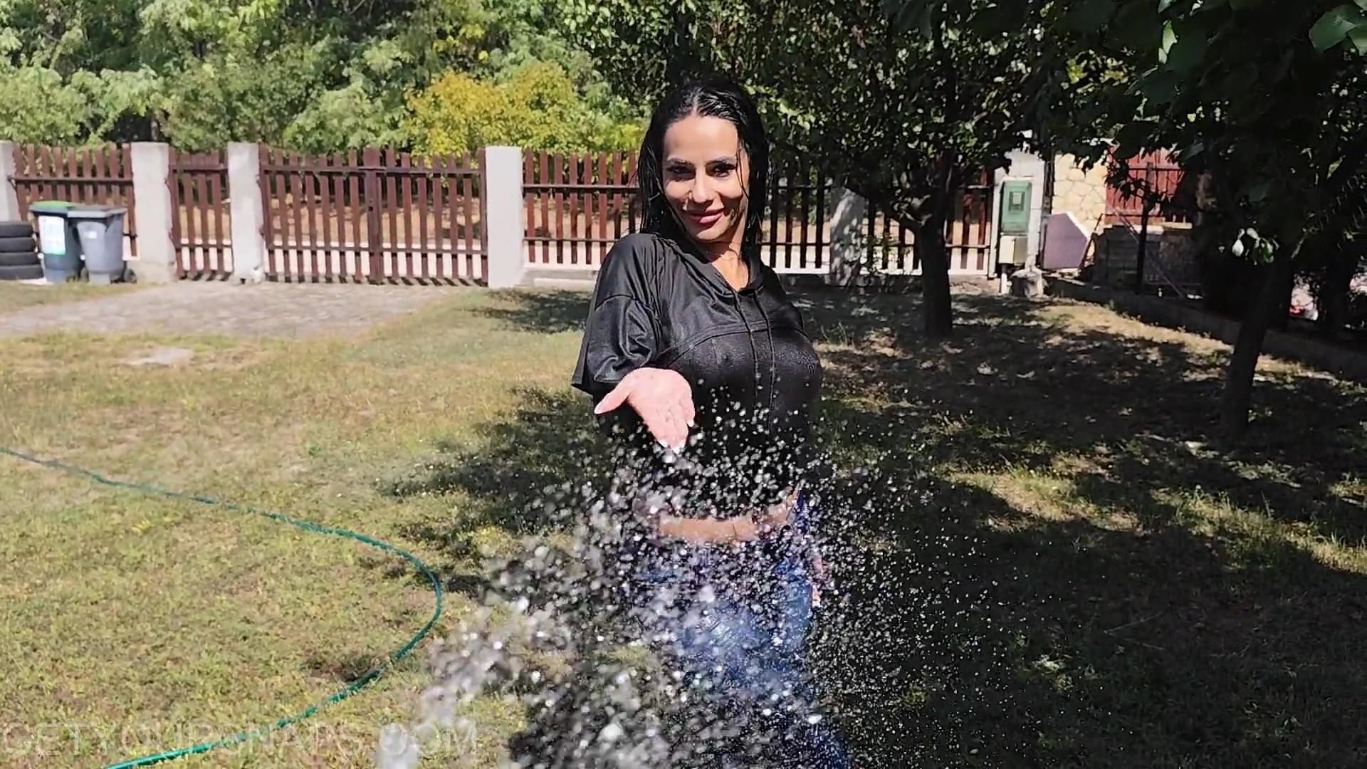Gina returns for another outdoor wetlook session — this time under the bright summer sun! ☀️💦 Wearing a casual black hoodie, jeans, and sneakers, she starts off playfully watering the garden before turning the hose on herself. The sunlight makes every drop glisten as her outfit slowly darkens and shines with the water.