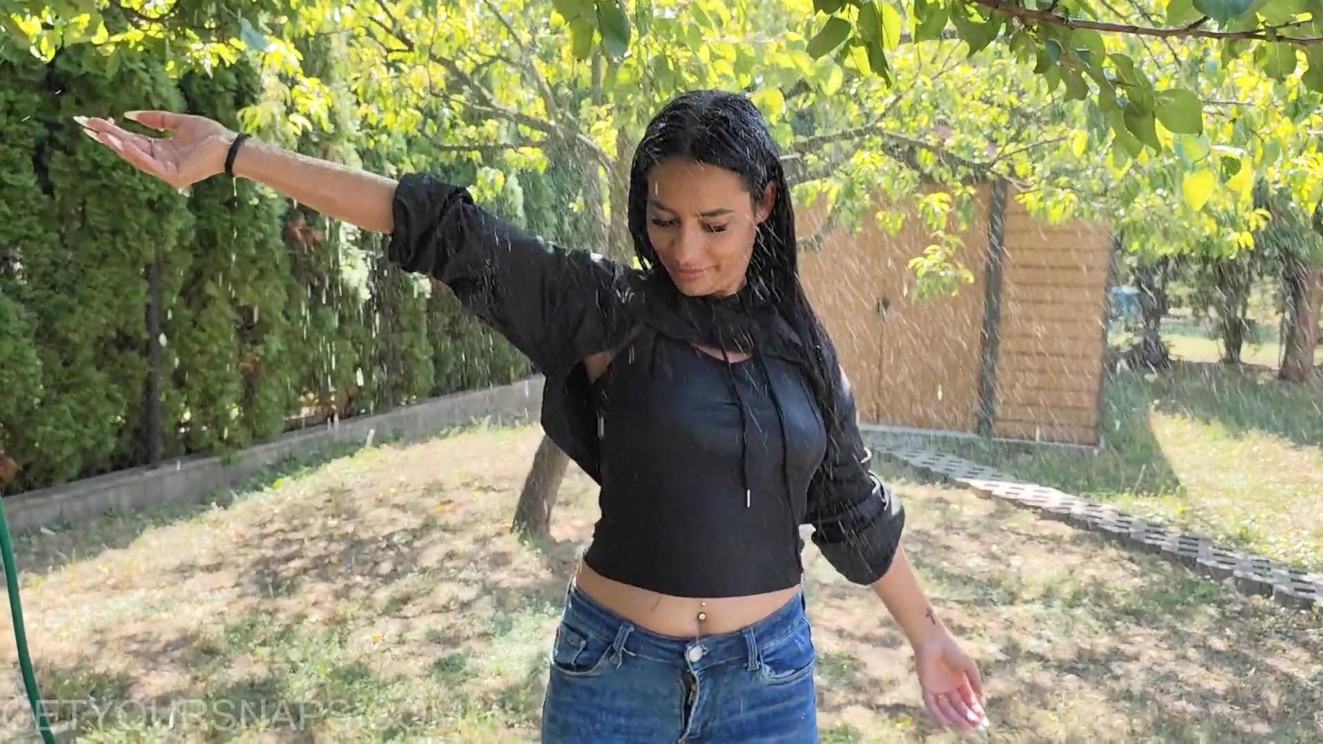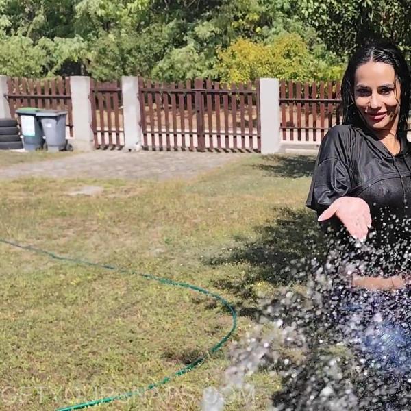 After a while, she takes off her hoodie, revealing a black top that soaks beautifully as she continues to enjoy the refreshing garden shower. The mix of playful energy, natural lighting, and pure summertime vibe makes this one of Gina’s most vivid outdoor wetlook videos yet.