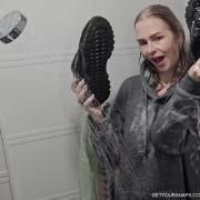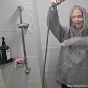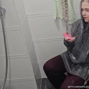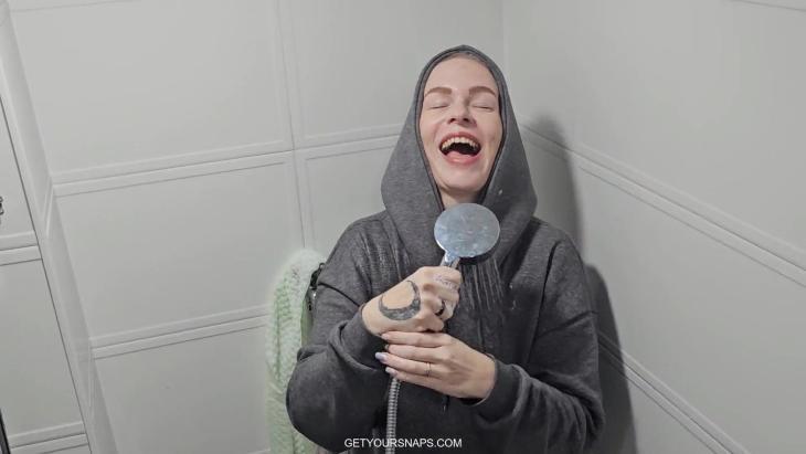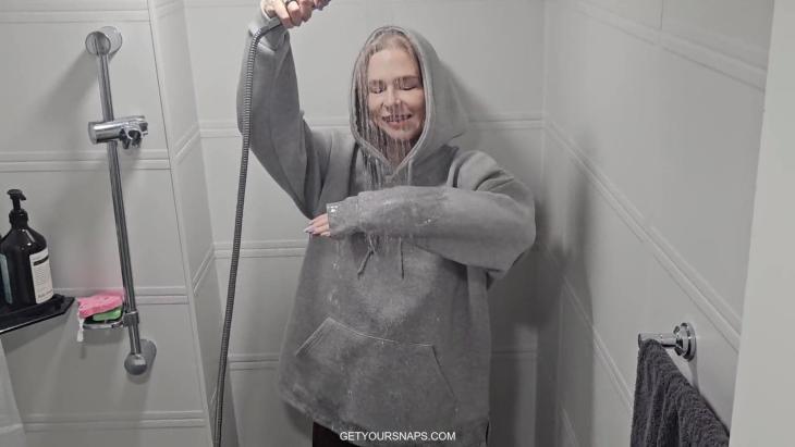 Throughout the video she smiles, jokes, and even playfully sings into the shower head, turning the entire session into a relaxed, light-hearted wetlook experience. By the final minutes, every layer of her clothes is drenched and clinging, the hoodie shimmering under the water as she continues enjoying the shower.