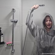 Rain steps into the shower wearing a soft grey hoodie and matching sweatpants – a cozy outfit that quickly transforms as soon as the water starts flowing. The thick fabric of both the hoodie and the pants absorbs water instantly, becoming darker, heavier, and clinging tightly to her body. Rain fully embraces the moment, playfully directing the shower stream onto her hood, sleeves, face, and chest while laughing and enjoying the sensation.