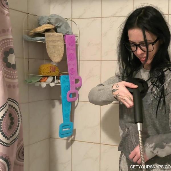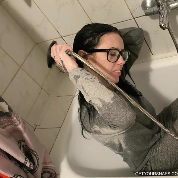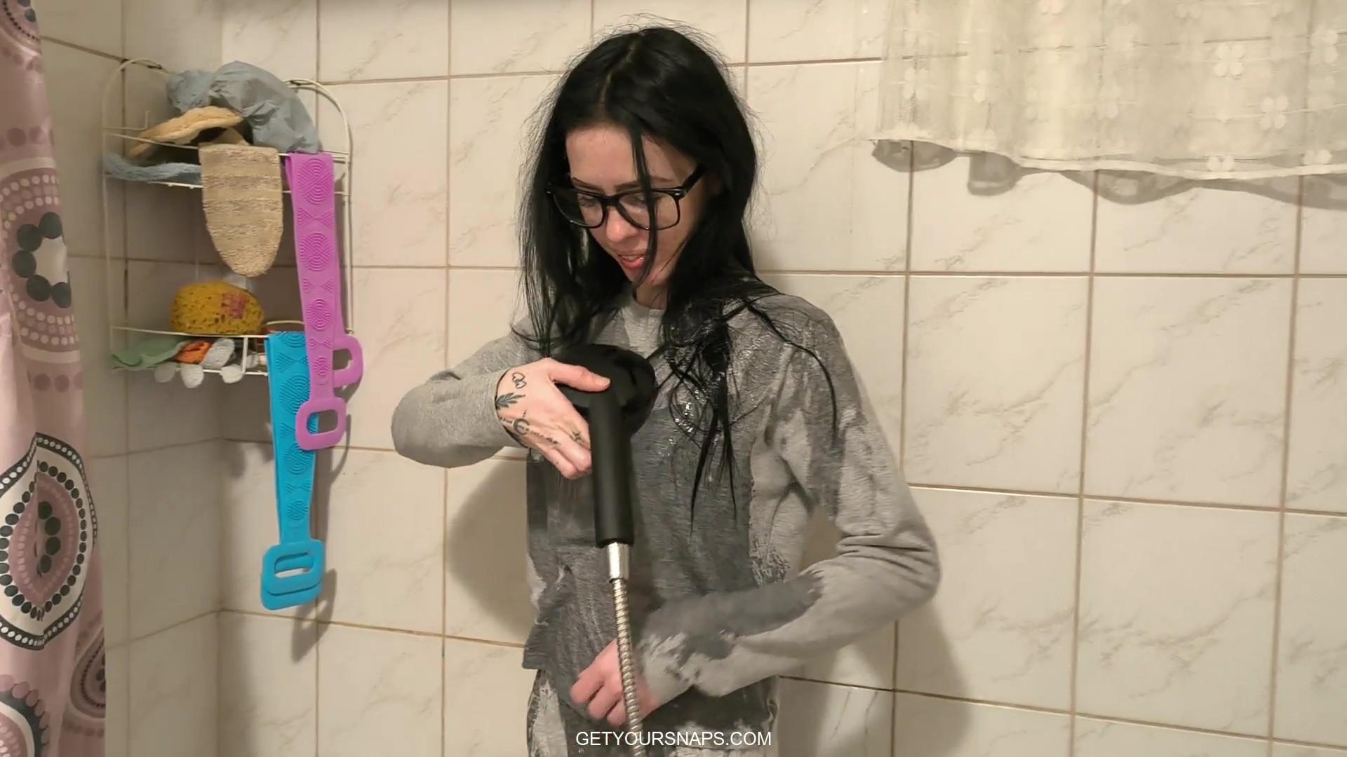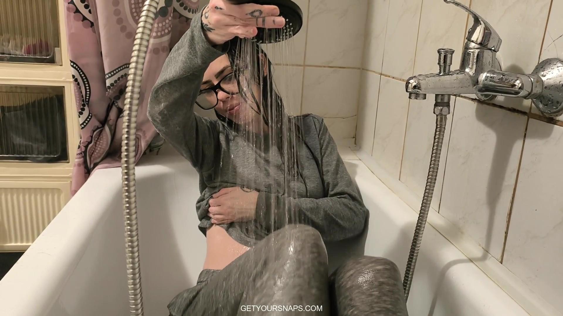 Carol steps into the shower wearing a full gray tracksuit and glasses, ready to get soaked from head to toe. She slowly lets the water run over her top and sweatpants, watching the fabric darken and cling tightly as it absorbs every drop. With a playful smile, she lifts her shirt to feel the warm water underneath, letting it run across her skin and through the layers of the thick material. Sitting down in the bathtub, she enjoys the heavy soaked clothes as they completely cover her, relaxing under the shower spray like it’s the comfiest outfit to get wet in.