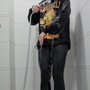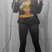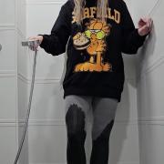 Rain takes a playful shower fully dressed in a black Garfield hoodie, soft cat-paw socks, and tight leggings. She slowly soaks each piece of clothing with the handheld shower head, letting the water run down the fluffy cartoon sweater and into her leggings until everything is drenched.