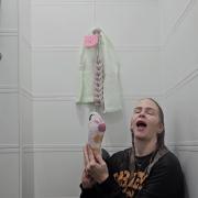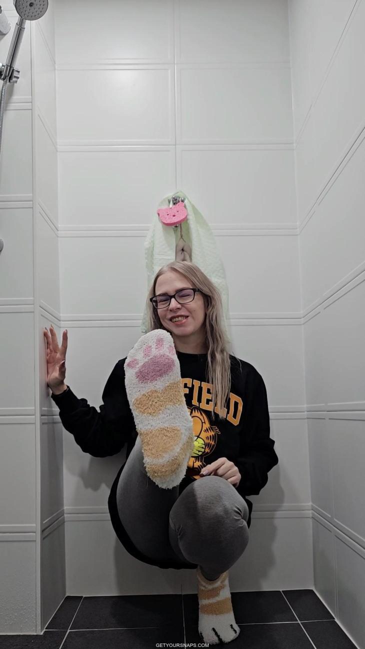 Her cozy cat-paw socks get soaked as well — first standing under the water, later sitting on the shower floor squeezing the water from them and even pouring water out of her shoe. Rain enjoys every moment, laughing, splashing, and experimenting with how the textures get heavier and shinier as they absorb more water.