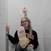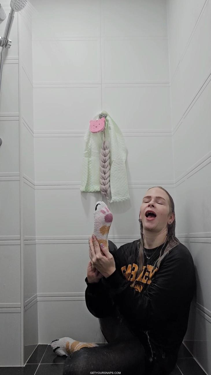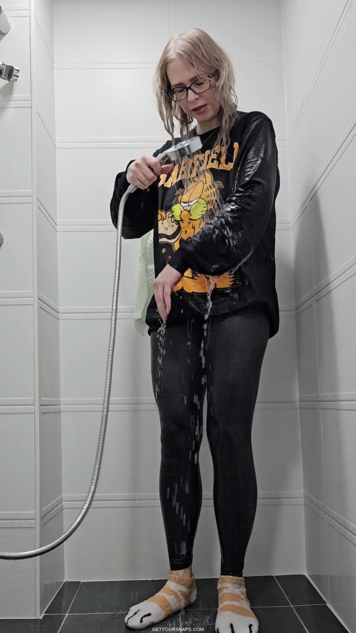 Near the end, she removes her wet leggings to reveal dry light grey leggings underneath, then continues soaking them too, turning the entire outfit into a soaked, shiny wetlook ensemble. A fun, quirky, character-style wetlook shower with lots of playful sock and hoodie moments.