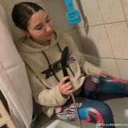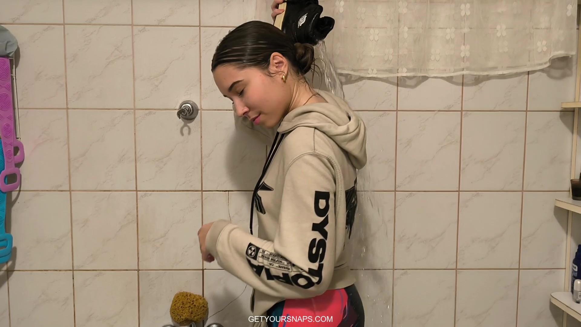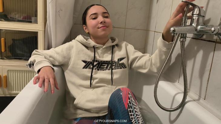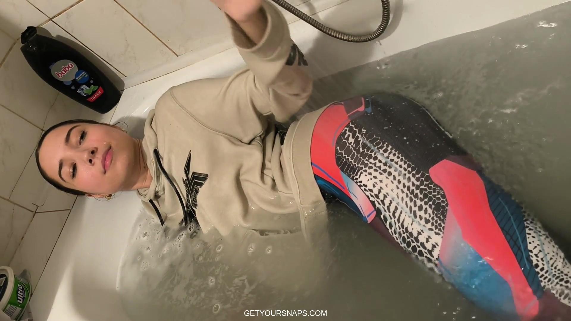 Once she’s in the warm water, her outfit becomes completely drenched, clinging to her as she relaxes and enjoys the moment. She moves around in the tub, splashing, dipping her head back, and letting the water flow over her clothes. Ellie also plays with the handheld shower, spraying her leggings and shoes to get them fully soaked.