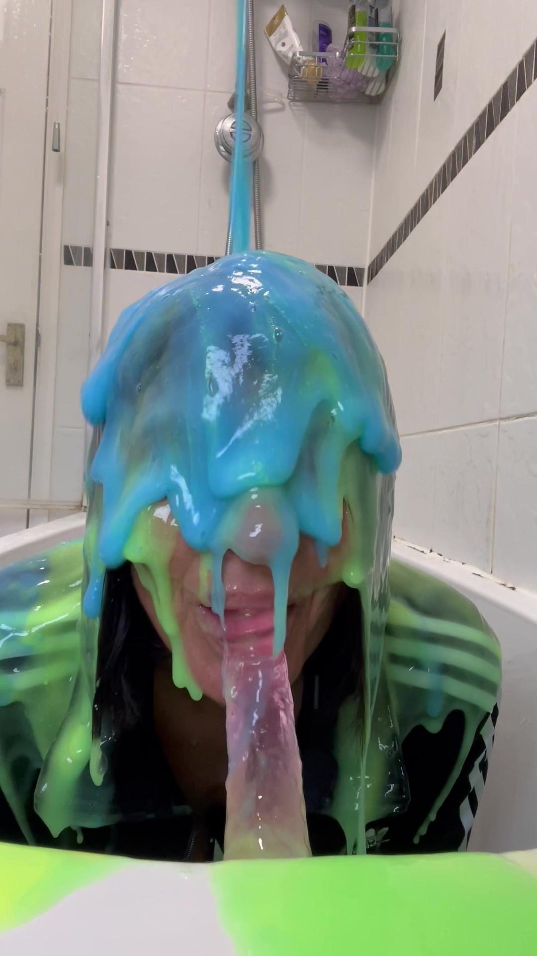 Sarah then unzips her top a bit more before going back to sucking your cock, with more and more gunge continuing to fall from above! She moves back to rub the gunge all over her body, covering her boobs in the gooey mess before the rest of the gunge is poured right over her head allowing her to then finish sucking your cock!