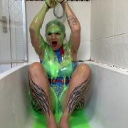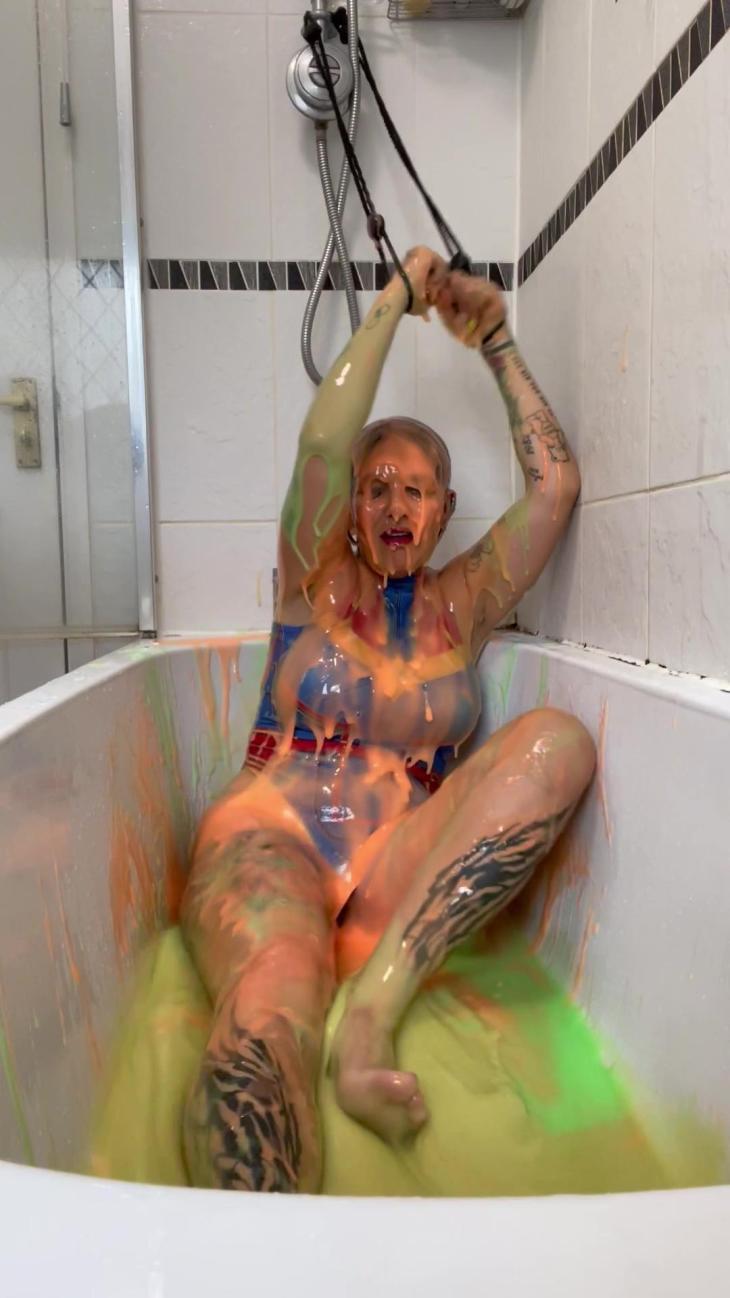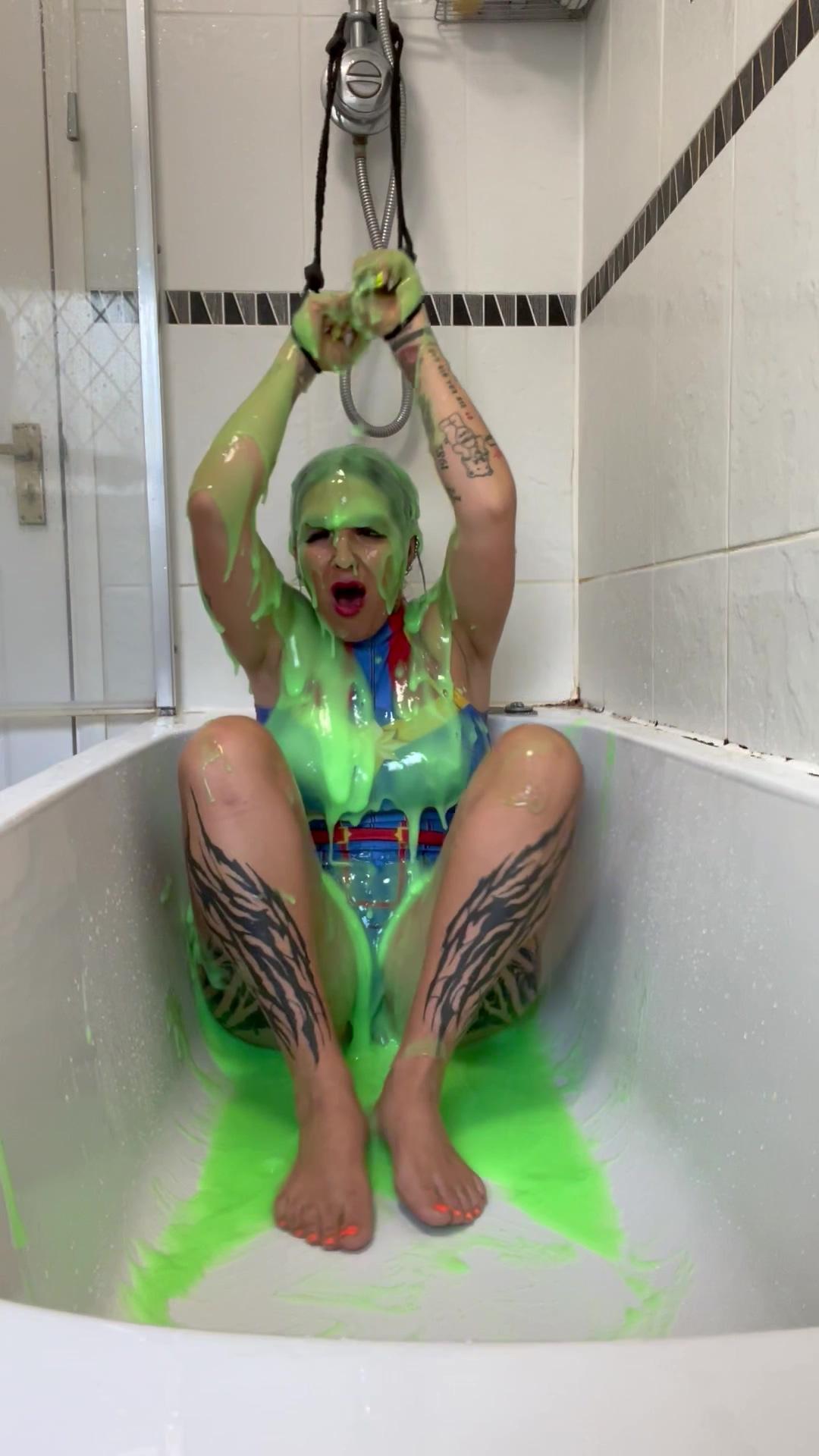More and more gunge falls from above, covering Vicky from head to toe, leaving her a very gooey mess!