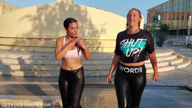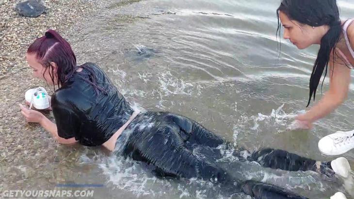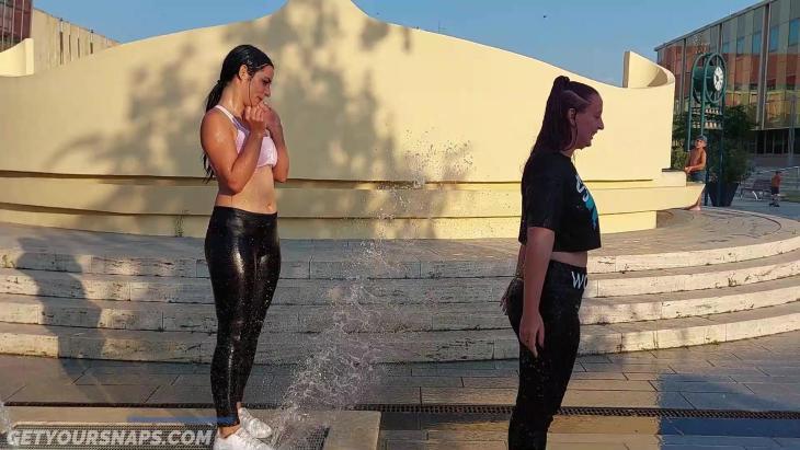 2 girl together in 2 locations. 1st place is a fountain. 2nd place is a riverside.
