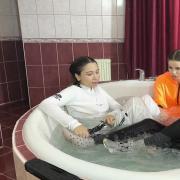 Sarah joins Harper and Ellie in the bathtub for a playful, chaotic and extremely splashy session. Fully dressed, they climb into the tub, soaking their outfits, shoes and hair while teasing each other with water, laughter and constant movement. Jets are running, clothes cling tighter with every splash, and the atmosphere quickly turns into pure wetlook fun.