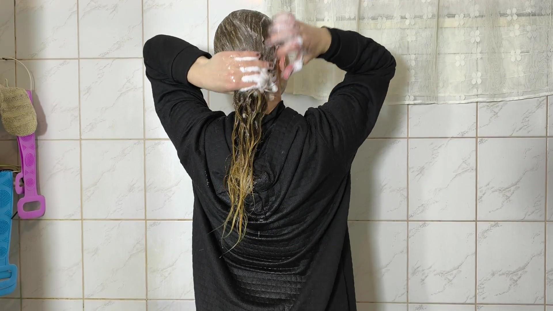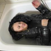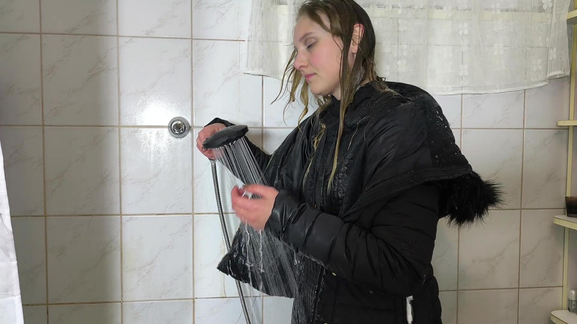 Still wearing her full winter clothes, Luna steps into the shower. Warm water washes away the snow and the cold, her clothes getting heavier and wetter with every second. She rinses her hair and enjoys the contrast between icy winter and cozy warmth.