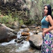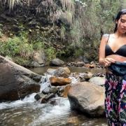 Pamela enjoys a quiet river setting surrounded by rocks and flowing water.