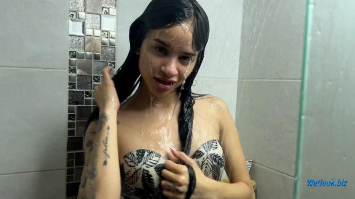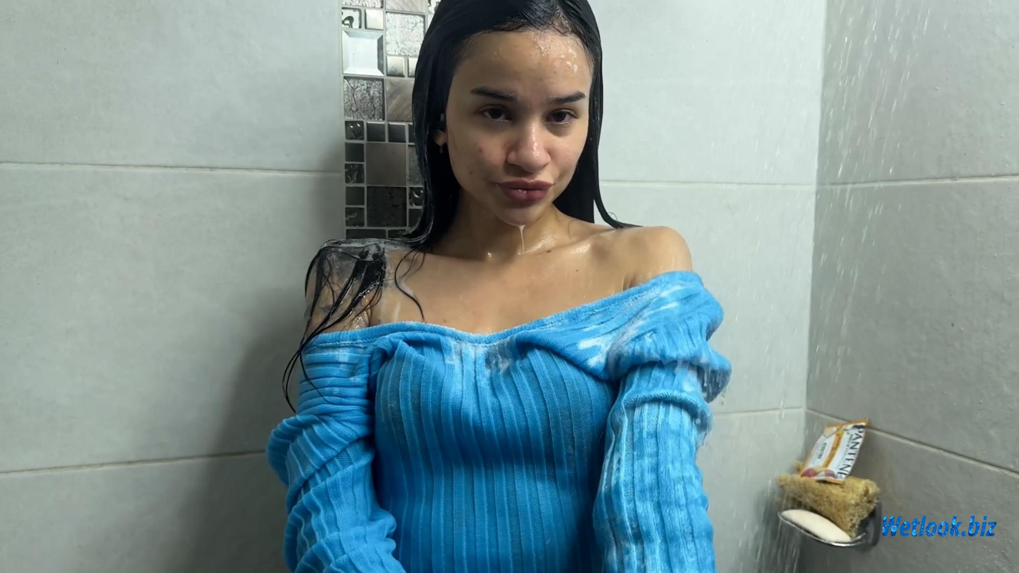 The focus is on real water interaction with clothing, wet fabric movement, and natural shower conditions. The video captures authentic wetlook details such as soaked materials, wet hair, and continuous water flow without edits or post-processing.