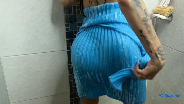 This video shows a full wetlook shower transformation featuring Pety in a tiled bathroom setting. Starting in a patterned strapless top, she gradually becomes fully soaked under running water. Later, she wears a blue ribbed dress that absorbs water and changes texture throughout the shower.