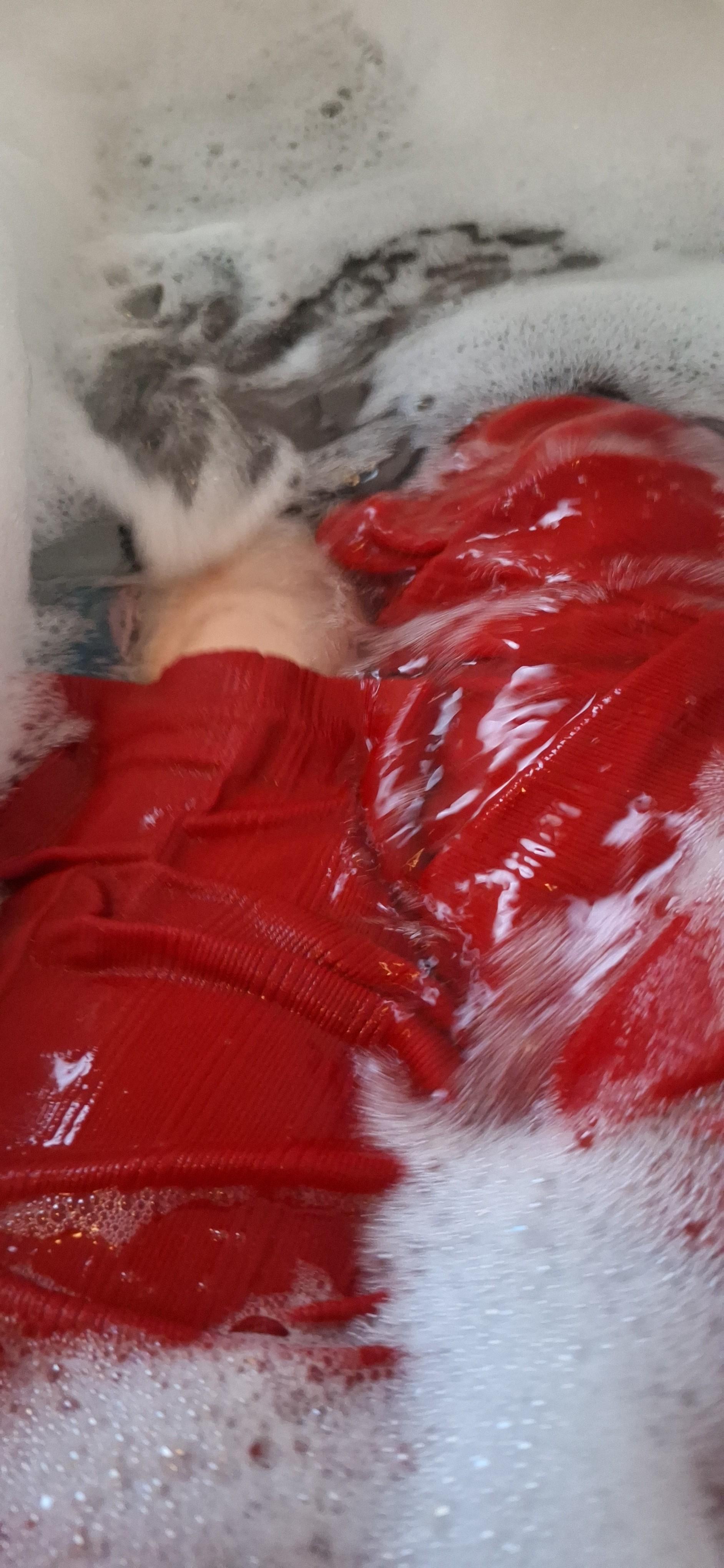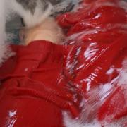 wetlook, wet wide red pants, black nylon kneesocks, black shirt, soapy/foam...
