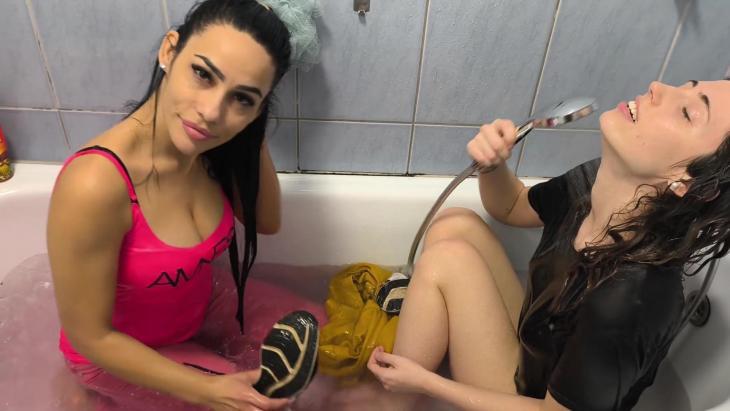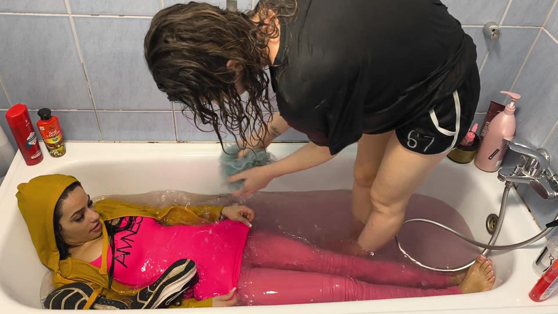 Gina steps into the tub to join Nina and the playful soaking quickly turns into a fully drenched, splash-filled experience. From the first moments the water runs over their outfits to the relaxed, close-up wet scenes, every detail is captured in smooth 60p. Expect intense wetlook visuals, natural interaction and plenty of flowing water as their clothes get completely soaked.