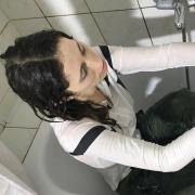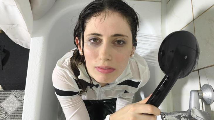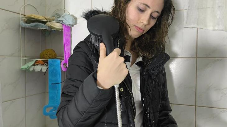 Nina steps into the bathroom fully dressed in a thick winter coat, curious about how the heavy layers react to water. She slowly begins soaking herself using the shower, watching as the coat darkens, becomes glossy, and starts to cling under the weight of the water.