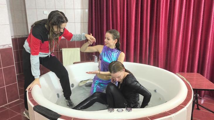 The second part of this three-part wetlook series continues as Harper joins Sarah in the hot tub. Sarah already starts the session in her black, leather-look outfit, fully soaked, when Harper steps in wearing a striking steel-blue set.