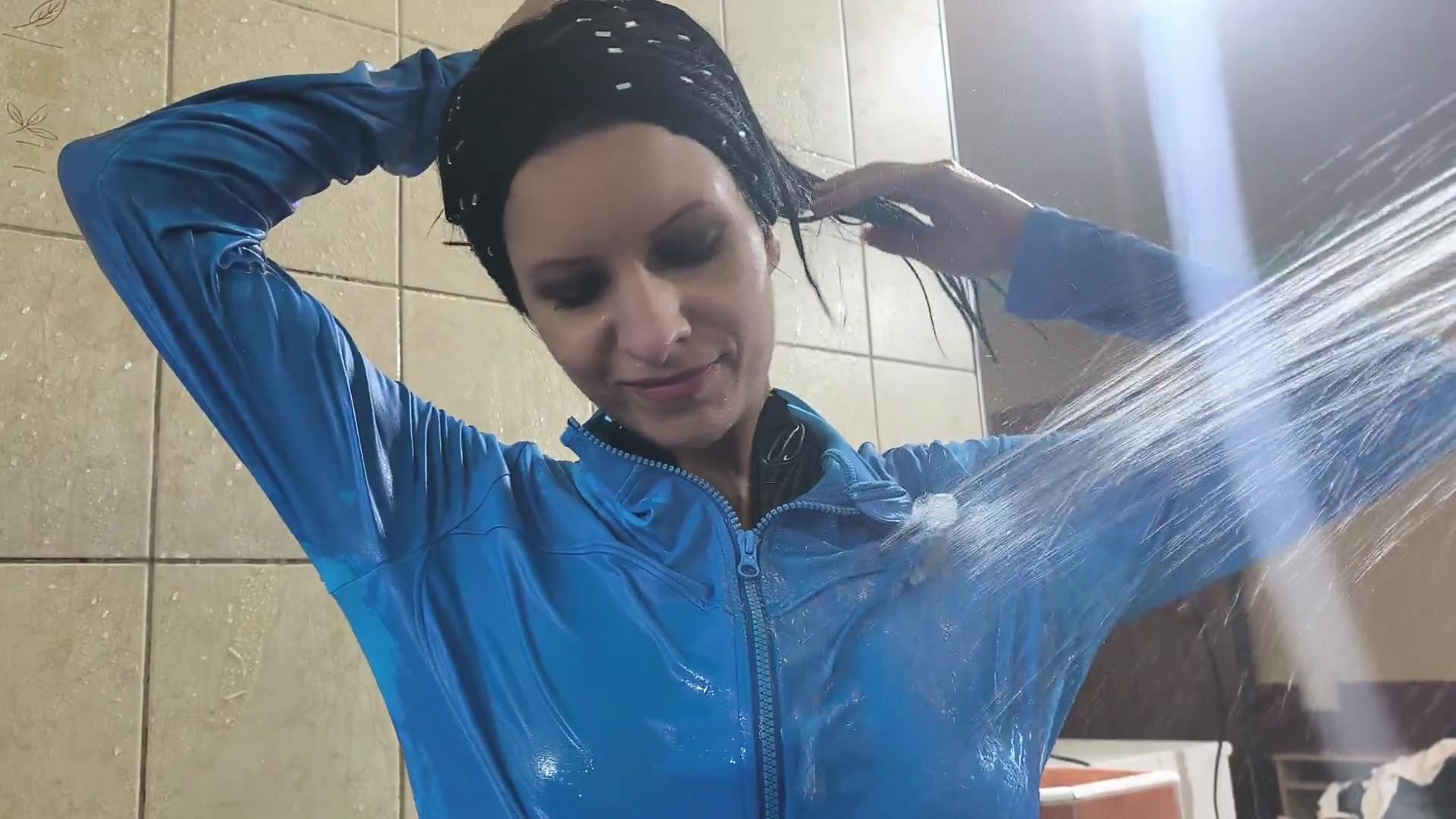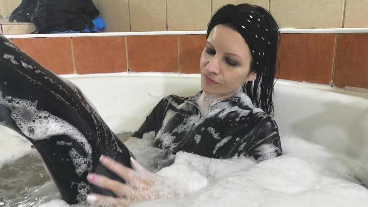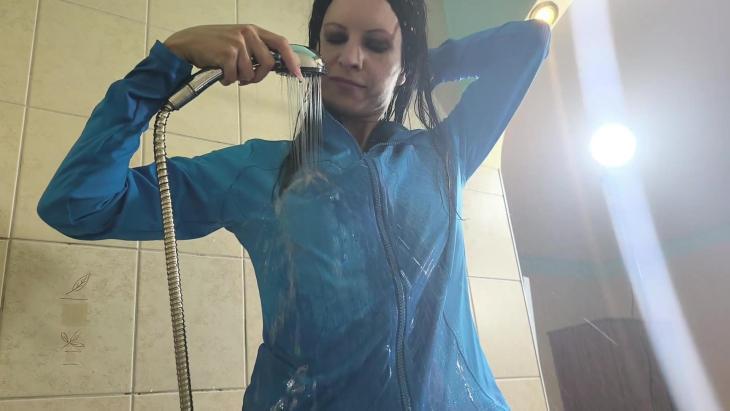 Later she puts the full outfit back on and remains in the bath, creating a relaxed, immersive wetlook ending with fully soaked layers.