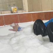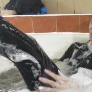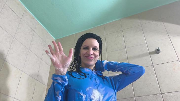 A detailed POV session focusing on layered clothing, foam and water interaction, with gradual soaking and a steady pace throughout.
